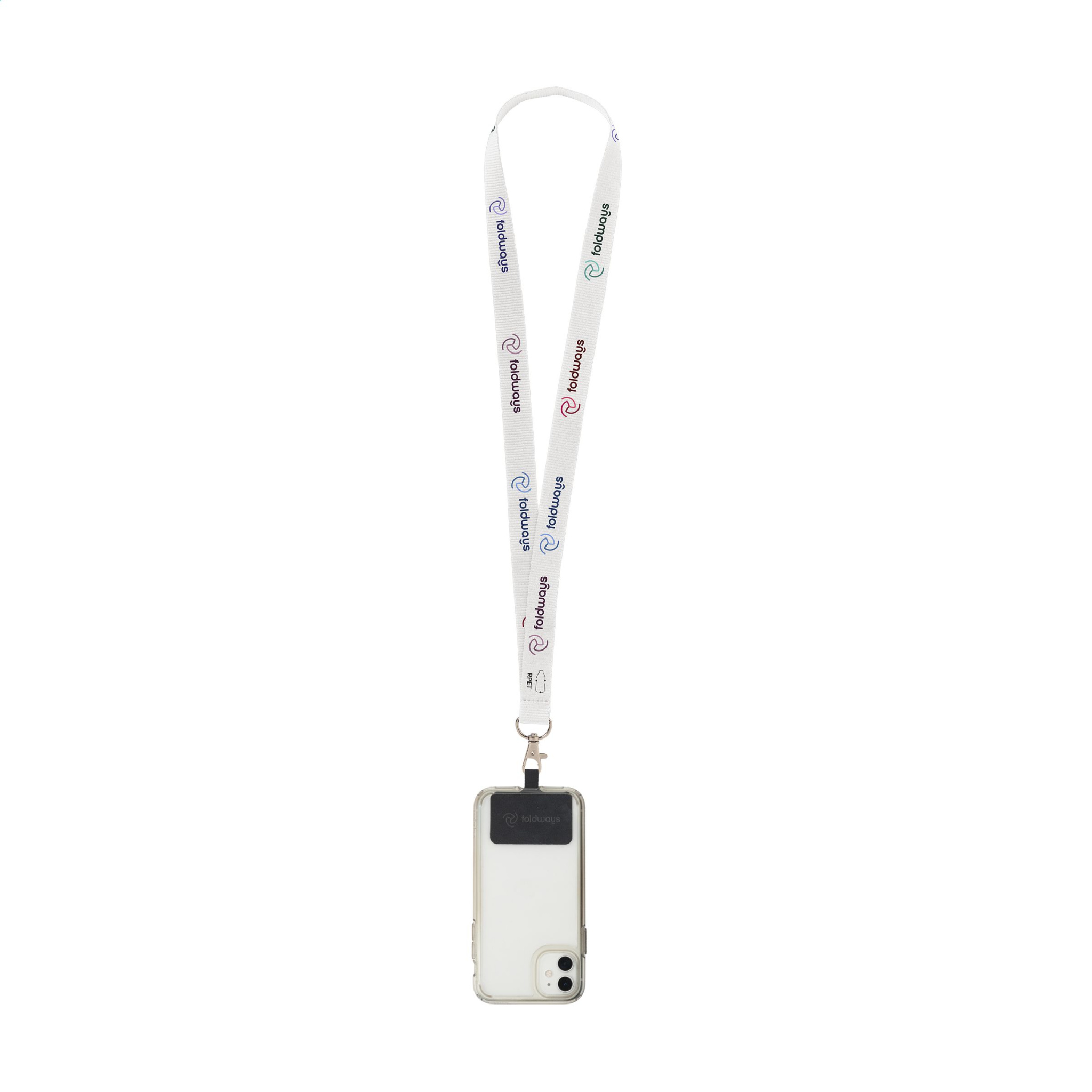 Vahvasta kudotusta RPET-polyesteristä valmistettu kaulanauha (kierrätetyistä PET-pulloista). Mukana metallinen karabiini ja yleismerkki. Patch mahdollistaa älypuhelimen kiinnittämisen kaulanauhaan. Tämän yhdistelmän avulla voit kuljettaa älypuhelintasi turvallisesti kaulassasi. Tämä varmistaa, että sinulla on puhelin nopeasti käsillä ja voit pitää kätesi ja vaatetaskut vapaina. Tämä patch on yhteensopiva useimpien älypuhelinten ja koteloyhdistelmien kanssa, mutta ei koteloiden kanssa, joissa on avoin pohja. Järjestelmä on suunniteltu siten, että puhelimesi latausportti ei tukkeudu, vaikka se olisi kiinnitetty kaulanauhaan. Sisältää täysvärisen sublimaatiopainatuksen kaulanauhassa. Valmistettu Euroopassa.