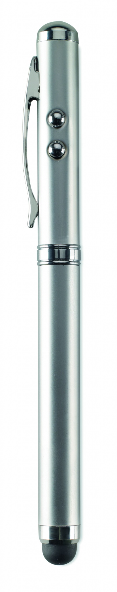Metallinen laserosoitin valkoinen led valo, punainen laserosoitin ja kosketusnäyttöpää. Sisältää kolme LR41 patteria, pakattuna metallirasiaan.