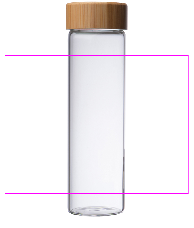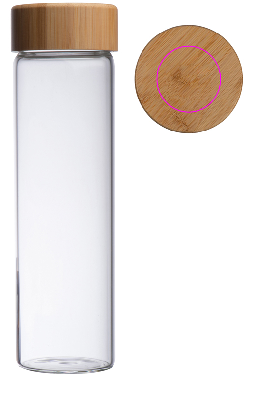 Lasipullo bambukannella ja täyttökapasiteetti 500 ml. Logosi kaiverretaan kanteen.