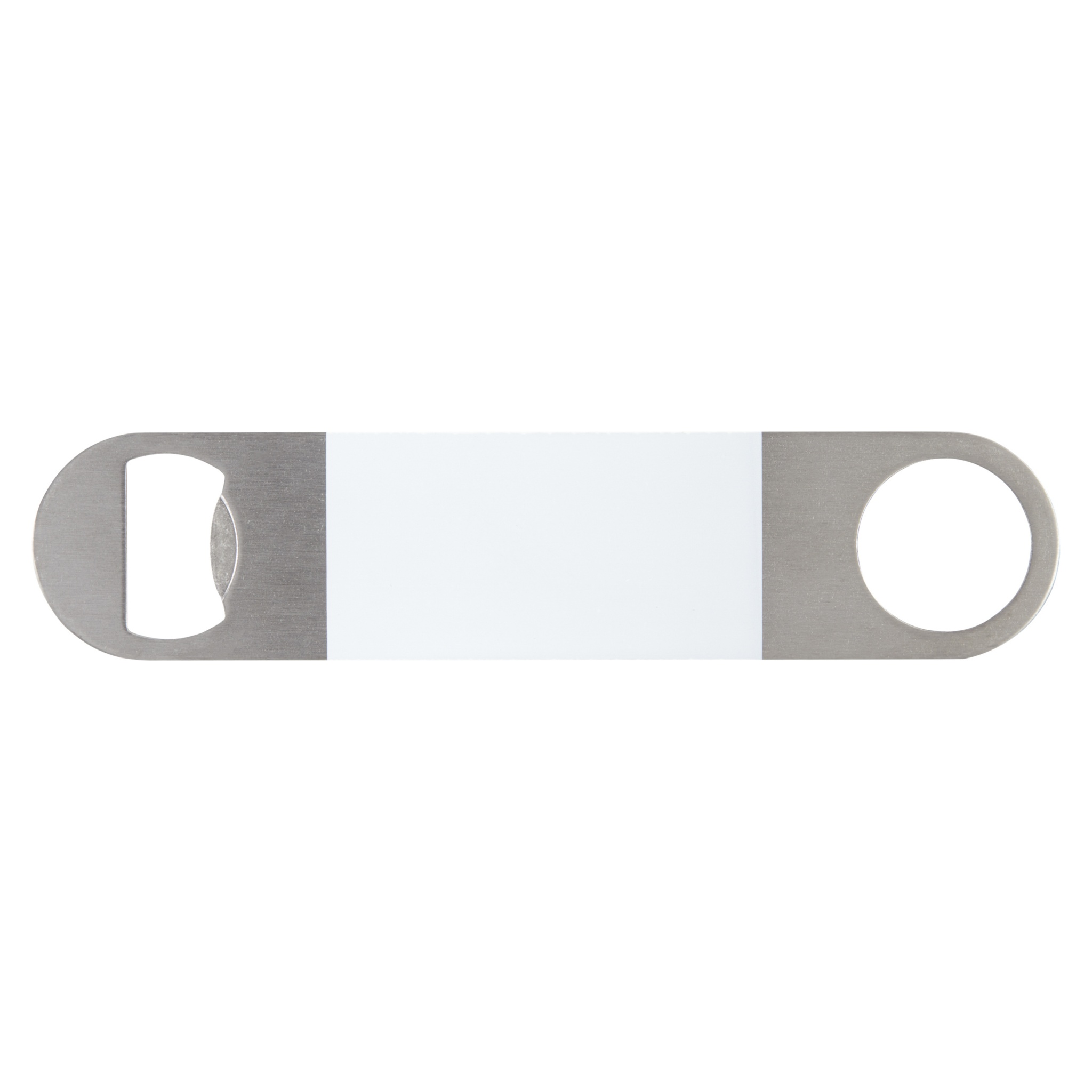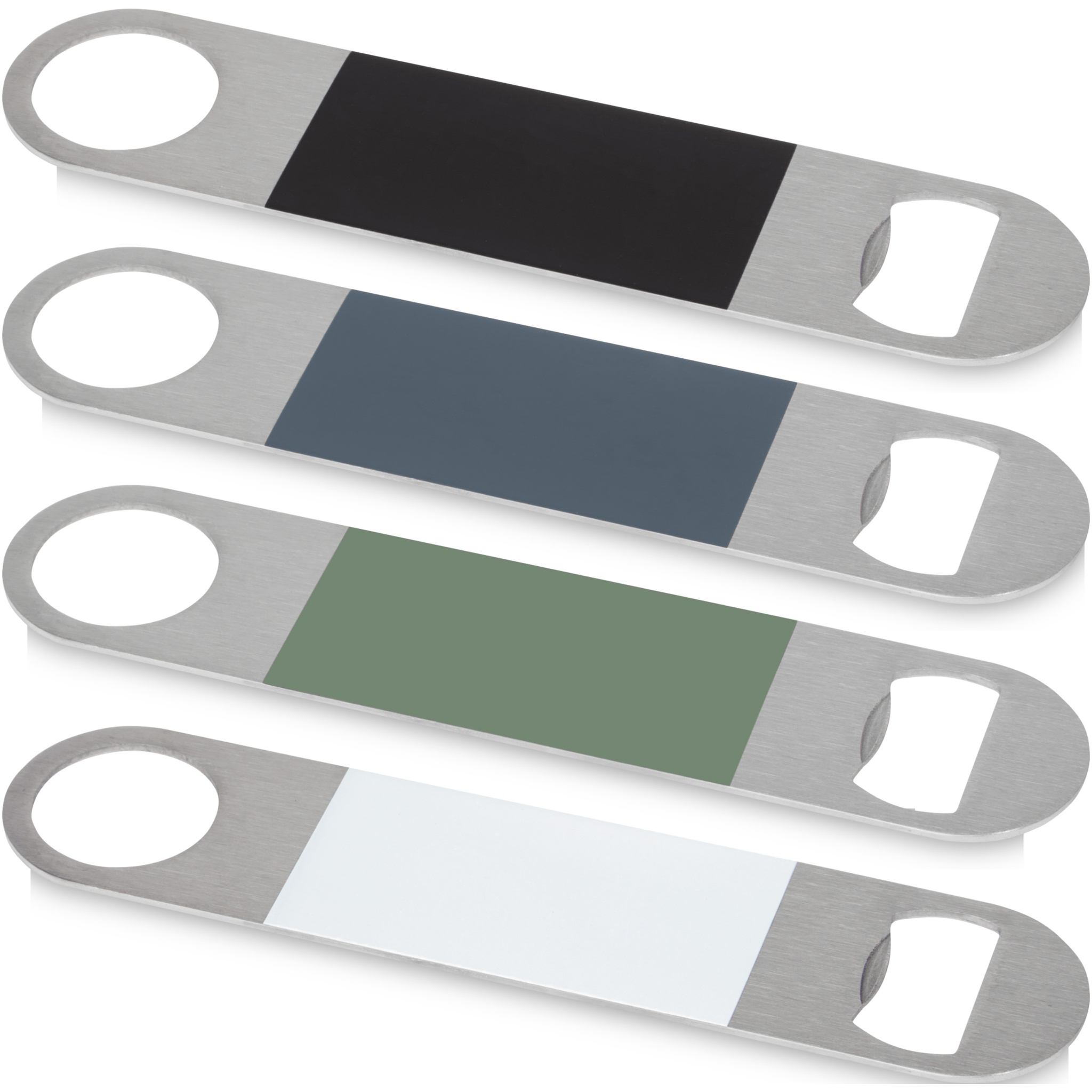 Ruostumattomasta teräksestä valmistettu pullonavaaja, jonka keskellä on suuri värillinen alue.