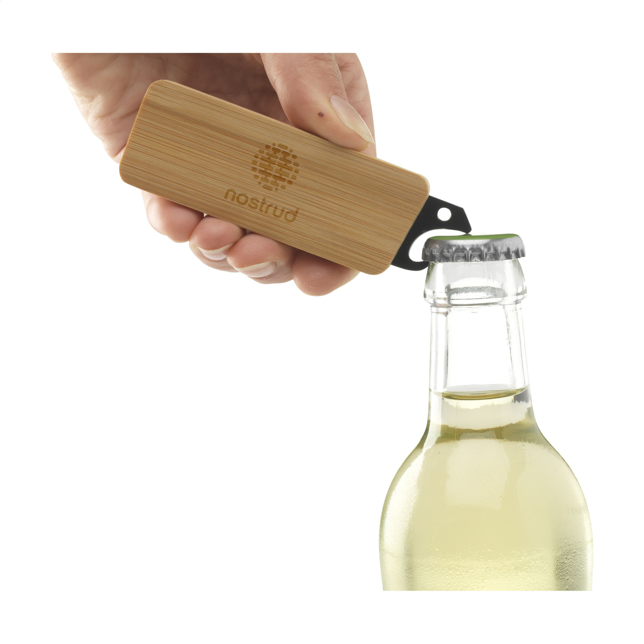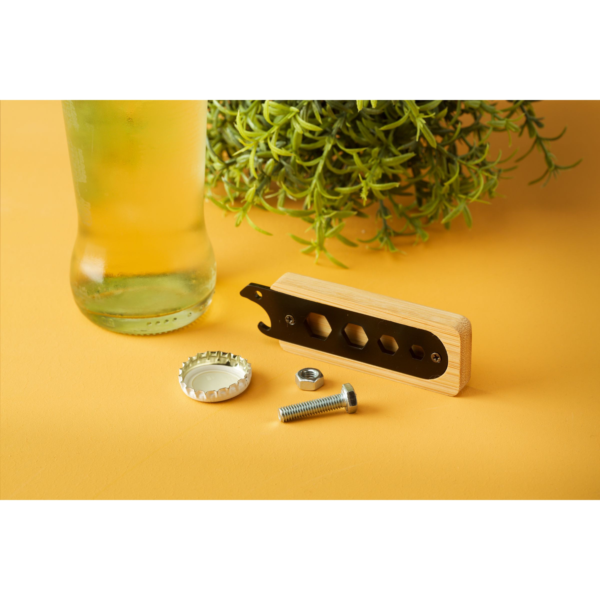 Kätevä monitoimityökalu, jossa on ruostumattomasta teräksestä valmistettu pullonavaaja bambukahvalla ja 4 erikokoista litteää avainta.