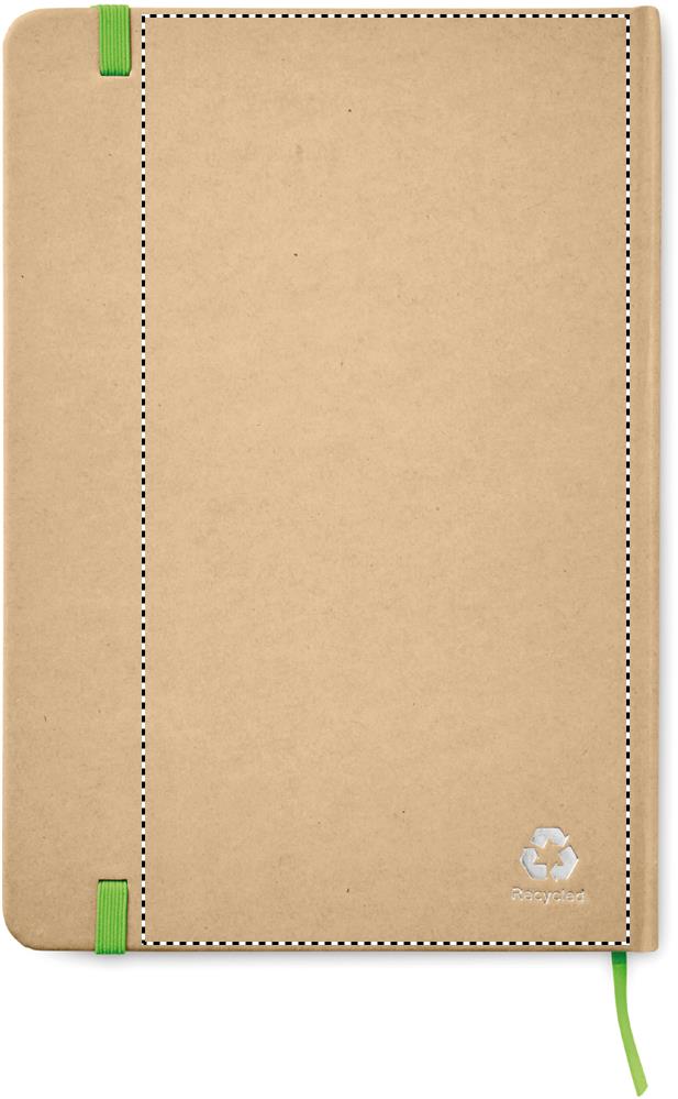 A5 muistikirja kovalla kierrätetyllä kartonkisella kannella, 160 viivoitettua sivua (80 arkkia) sisältää elastisen sulkuhihnan ja kirjanmerkin.