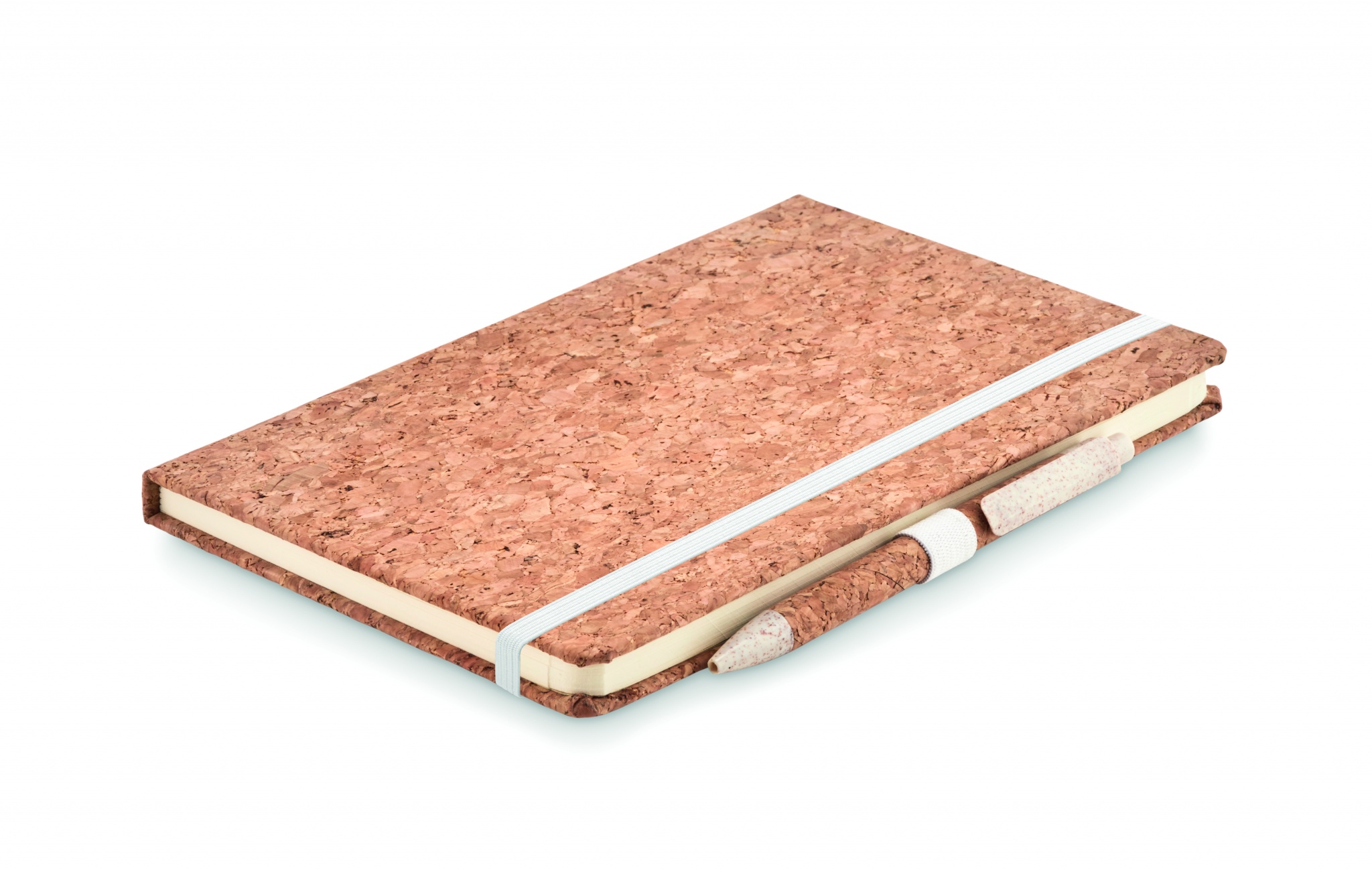 A5 muistikirja korkista valmistetulla kannella, sisältää 50% vehnän oljesta ja 50% PP valmistetun kuulakärkikynän, 192 viivattua sivua (96 arkkia) Elastisen kumilenkin ja kynänsilmukan. Pakattuna lahjapakkaukseen. Korkki on luonnonmateriaali, strukturaalinen laatu ja pinnan huokoisuus voi aiheuttaa eroavaisuuksia tuotteissa painatuksen jälkeen