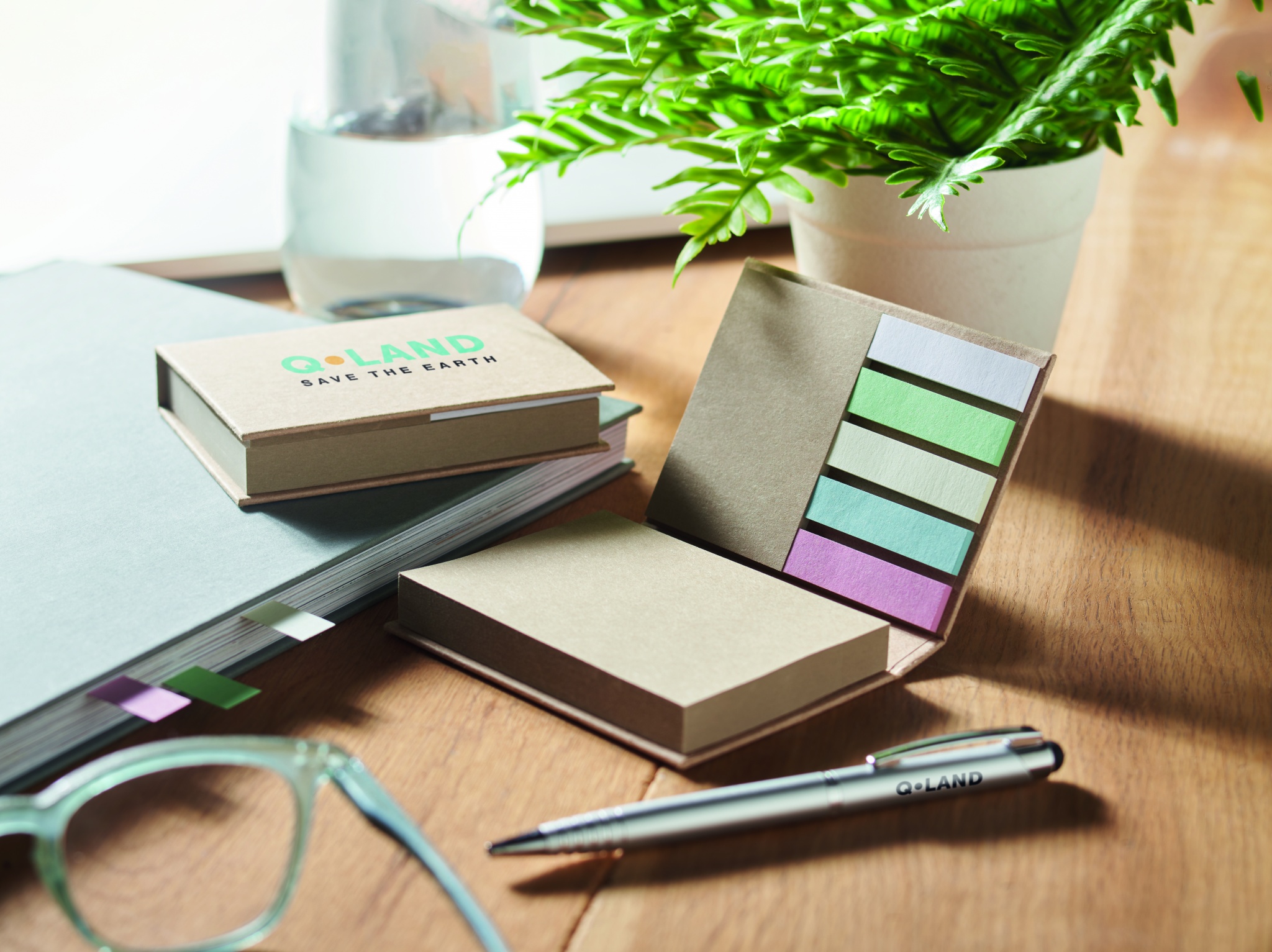3-osainen kierrätyspaperista valmistettu muistilappuvihko. Suuret ja keskikokoiset muistilaput ja 5 eriväristä sivumerkkiä. Valmistettu EU:ssa.
