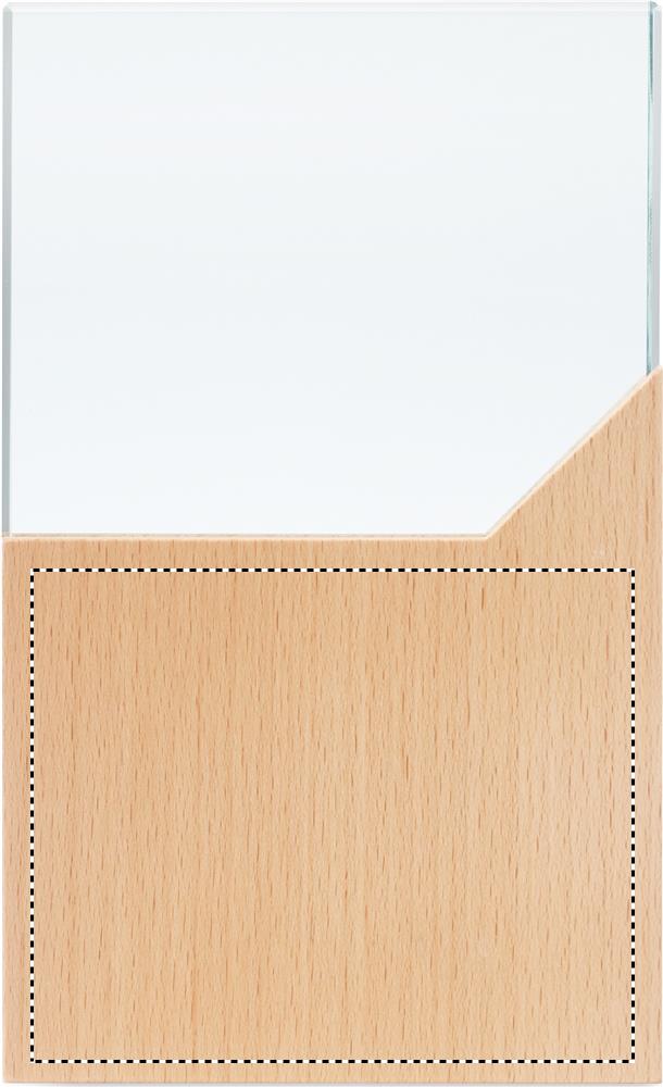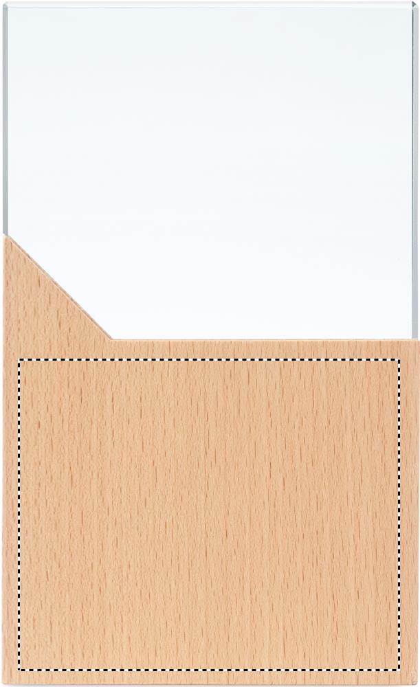Kristallipalkinto tai muistolaatta pyökkipuujalustalla, pakattuna lahjapakkaukseen.