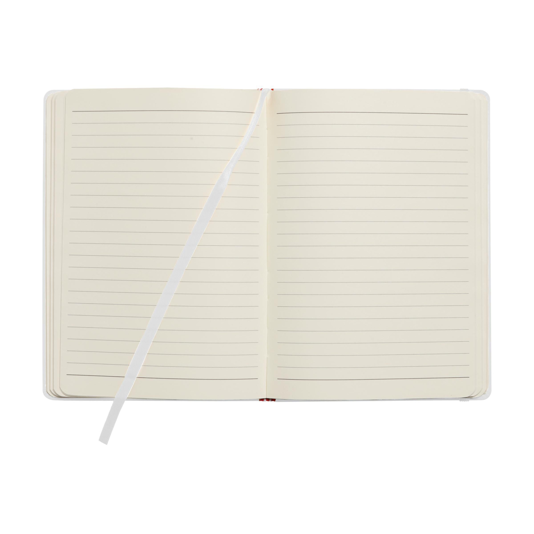 A4-kokoinen muistivihko, jossa 96 arkkia/196 sivua kermanväristä, vuorattua paperia (80 g/m²). Täydellinen sidonta, kova kansi, joustava kiinnitys ja silkkinauha.
