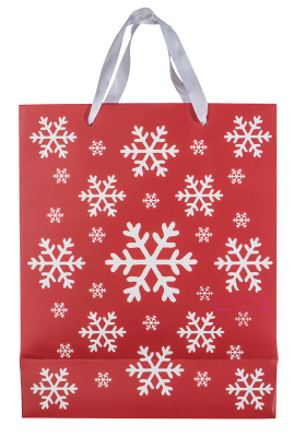 Paperista valmistettu joululahjapussi, jossa lumihiutalekuvio ja kaksi kahvaa. Painamme logosi tarraan.