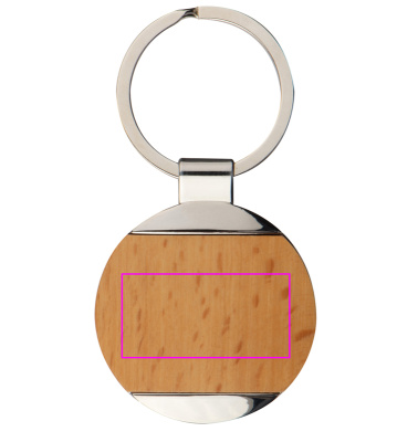 Tyylikäs metalliavainrengas, jossa on puinen sisäosa, johon logosi kaiverretaan.