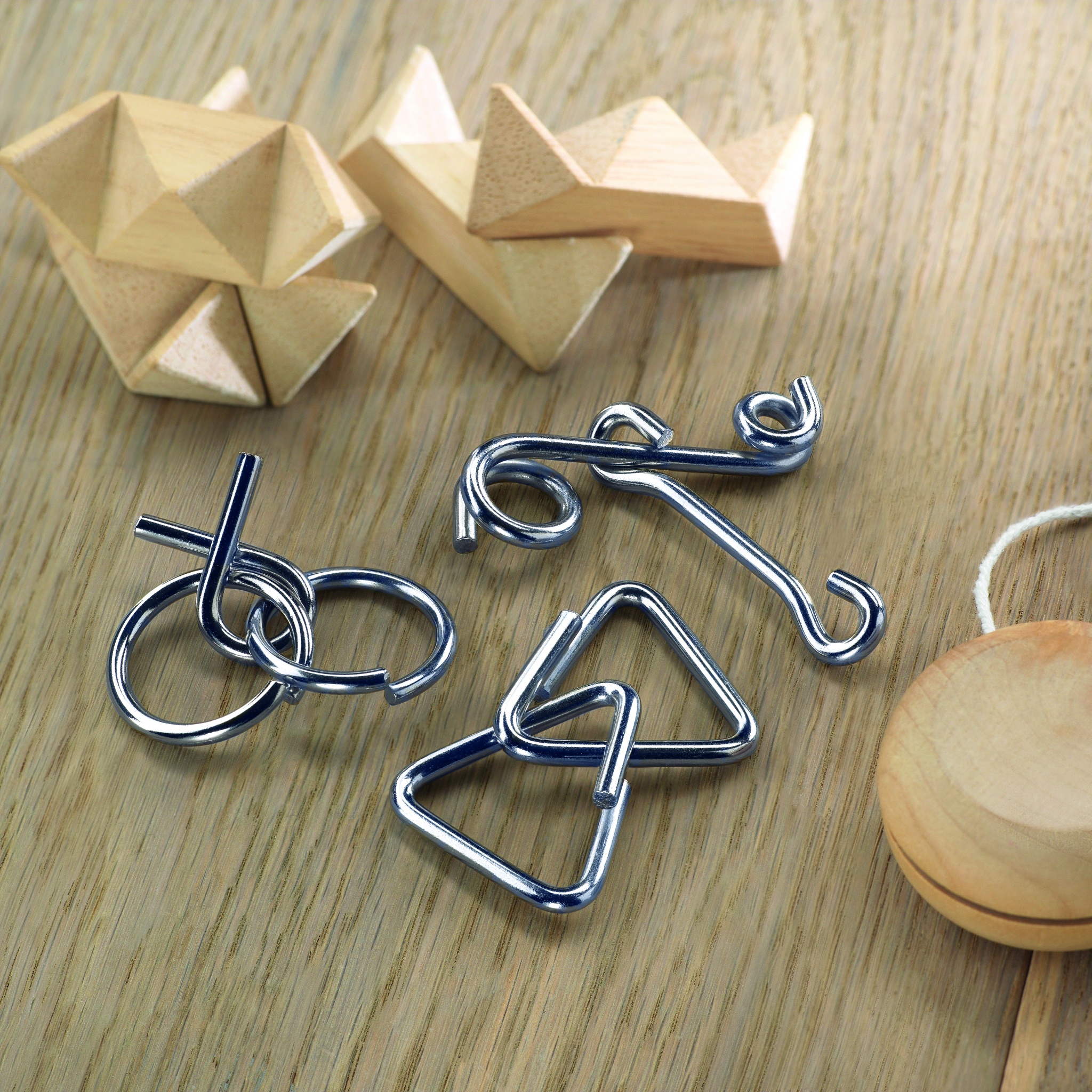 Sarja 3 erillaisia metallisia pulmapelejä, pakattuna puuvillapussiin.