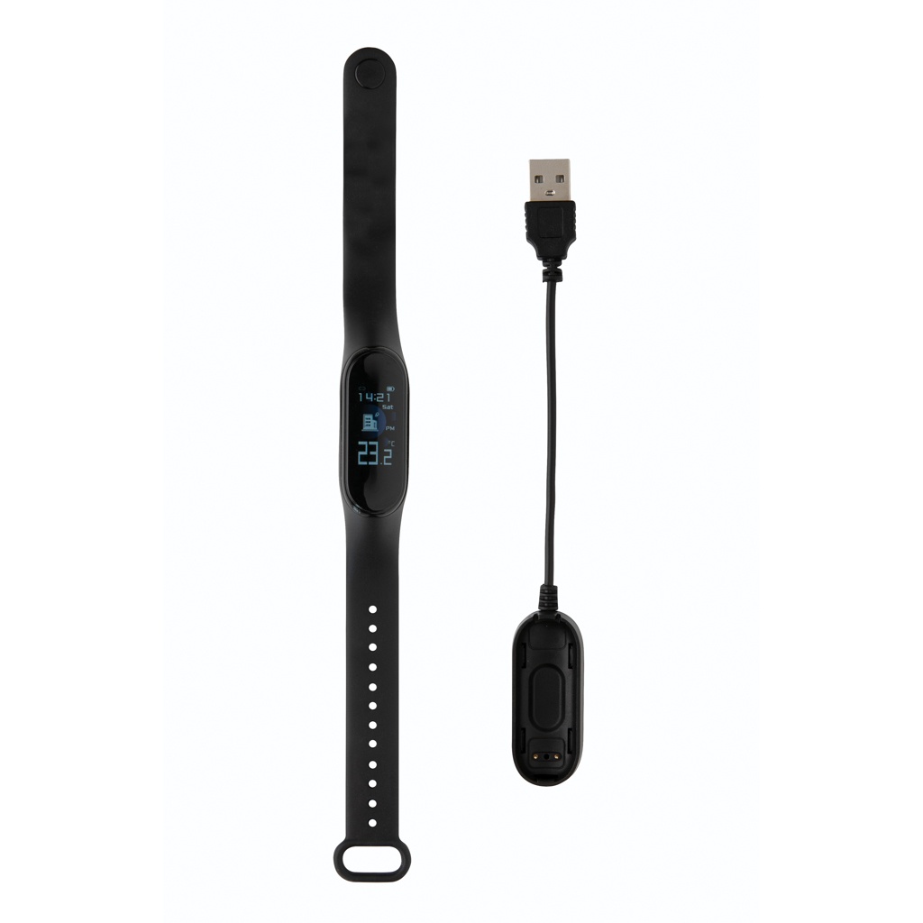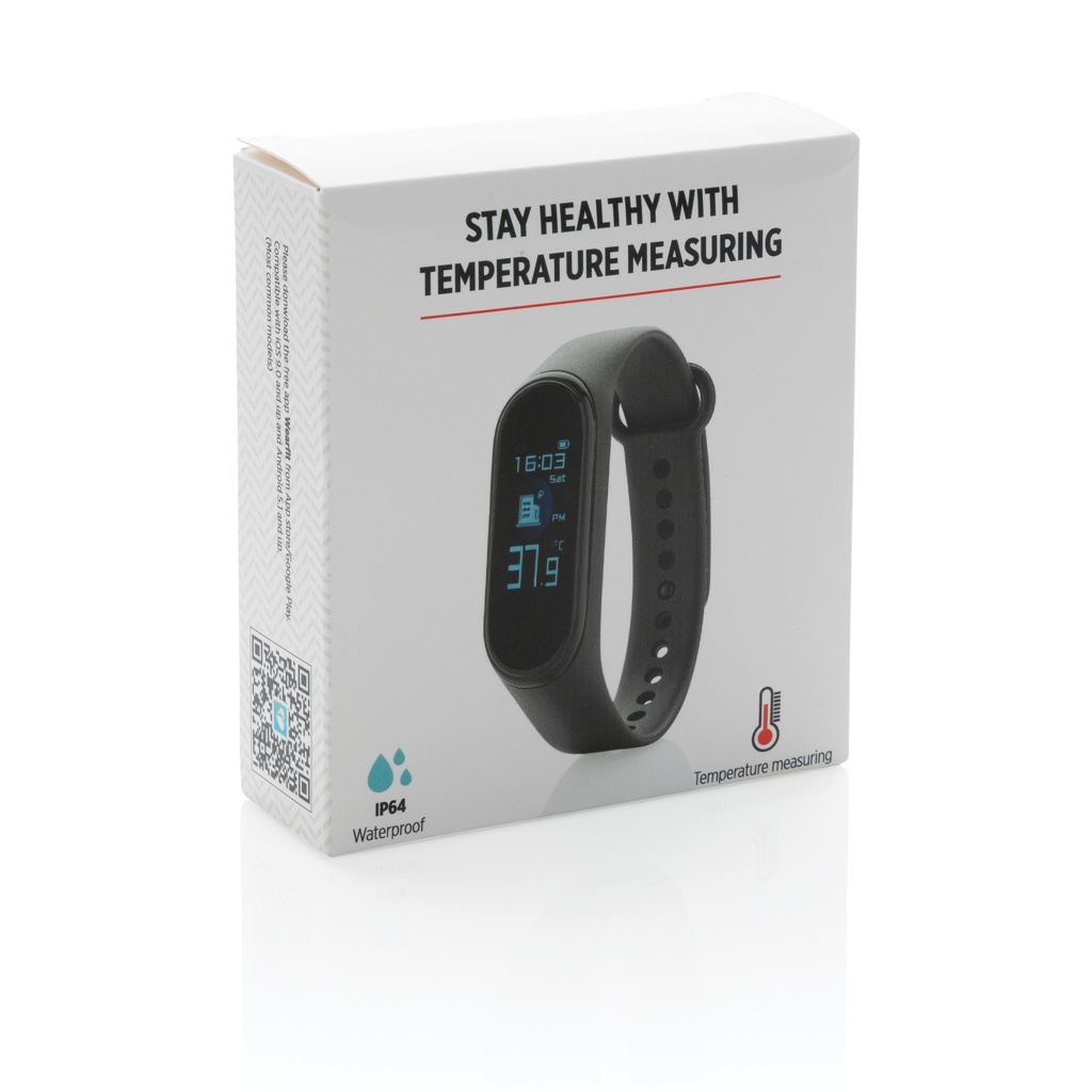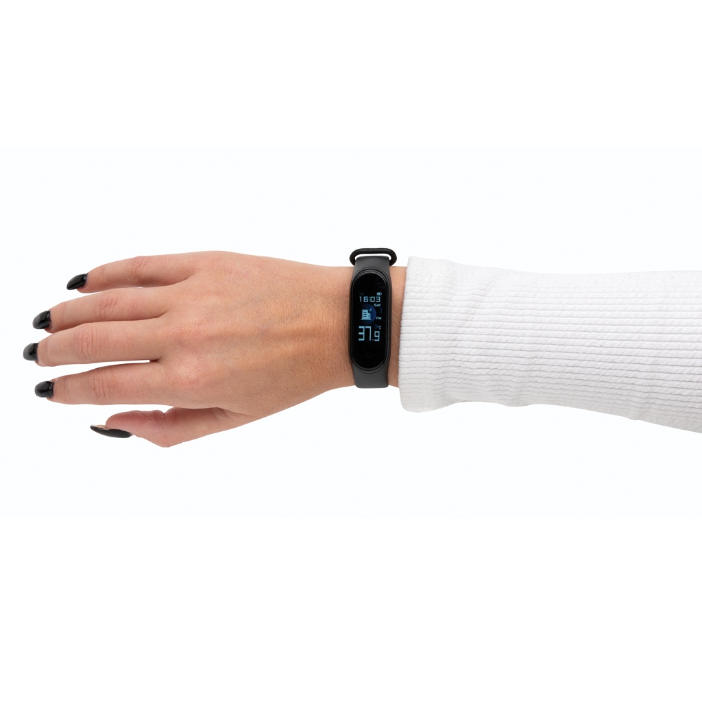 Pidä silmällä kehosi lämpötilaa ja yleistä terveyttäsi tällä rannekkeella, jossa on sisäänrakennettu lämpömittari (max. 0.2 asteen poikkeavuus). Rannekkeessa on 0'96 TFT värinäyttö. Toiminnot: BT 4.2, IP67 vedenkestävyys, saapuvat puhelut/viestit, ajastin, liikuntatila, kalorimittari, askelmittari ja unimittari. Ranneke on valmistettu pehmeästä TPU -materiaalista, joten sitä on mukava käyttää koko päivä. 90mAh A-luokan akku, standby -aika jopa 5 päivää.