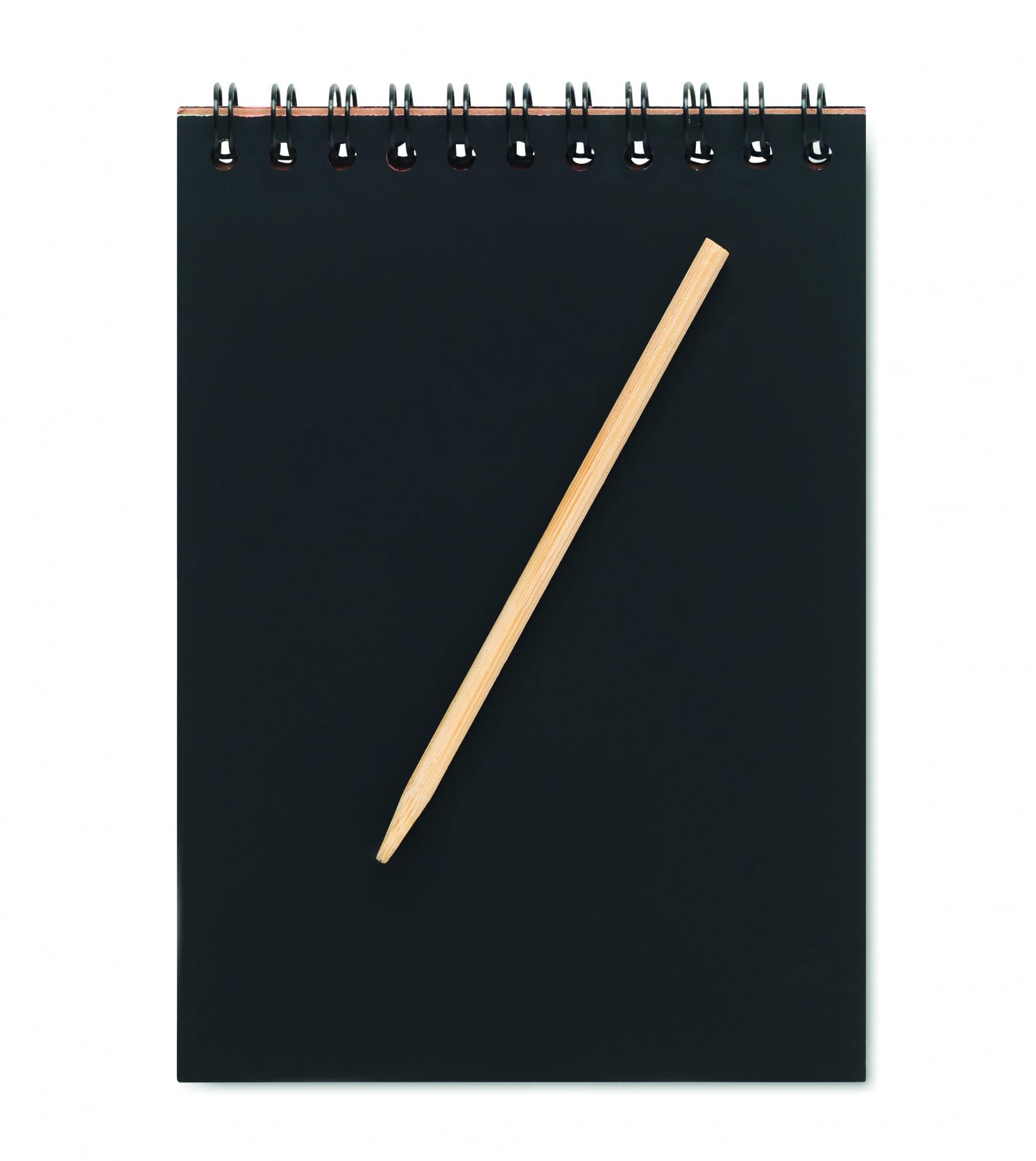 Kierrevihko, jossa 10 mustaa raaputettavaa arkkia ja puukynä.