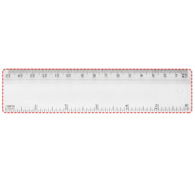 Muovinen viivoitin, jossa sekä sentit että tuumat (mitat painetaan vain merkattuun tuotteeseen).