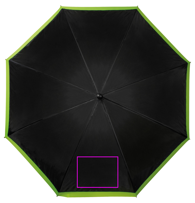 Suuri sateenvarjo, joka kiinnittää huomiota itseensä ja logoosi musta-neon- ja keltaisen värikontrastinsa ansiosta (190T polyesteri.) Painamme logosi segmenttiin.