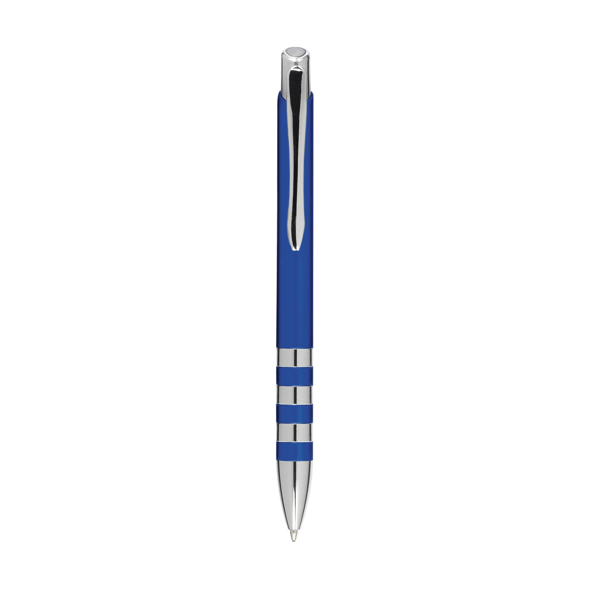 Sinisellä musteella varustettu kuulakärkikynä, jossa metallisen ilmeen piippu, metallipidike, painonappi ja kiiltävät piippurenkaat.