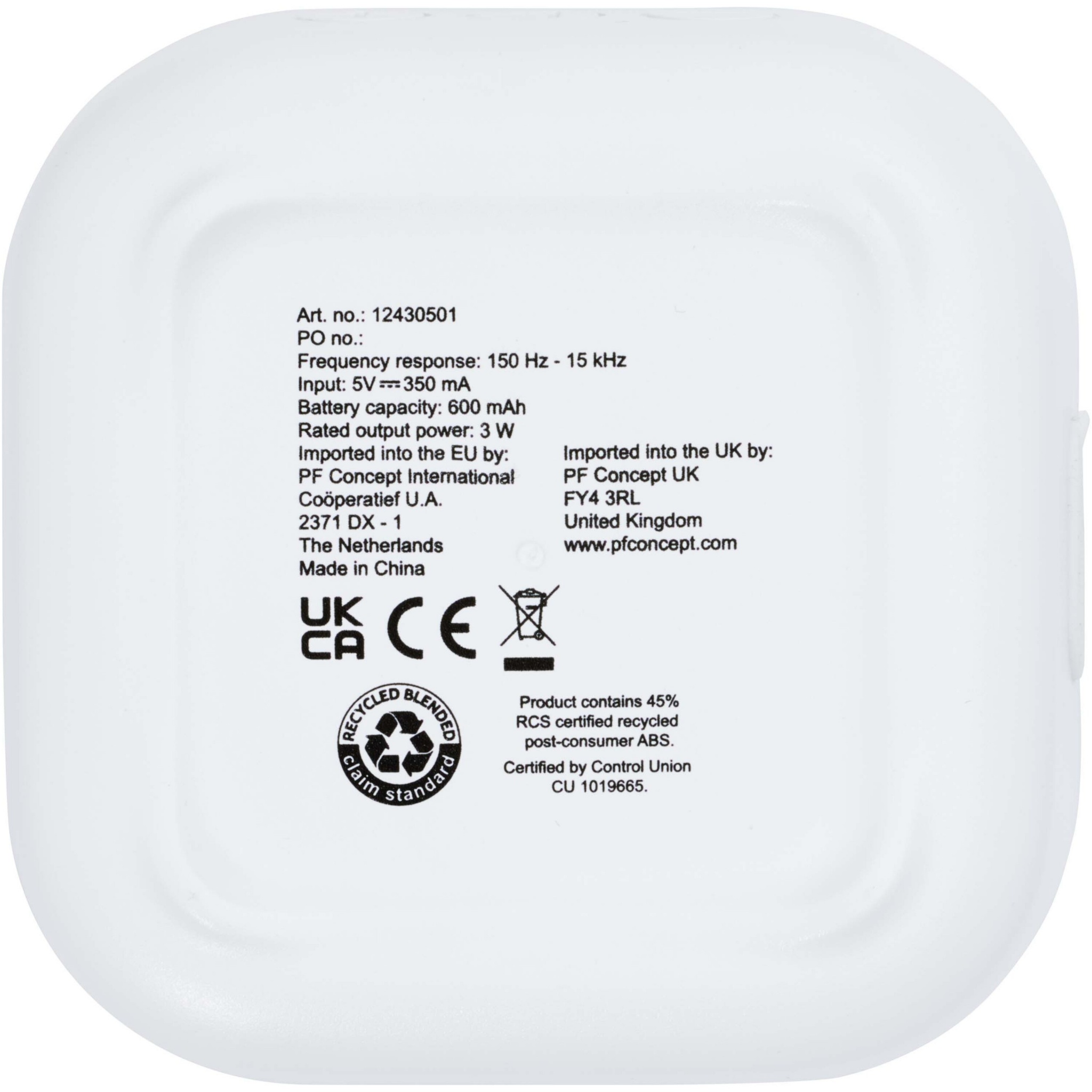 RCS-kierrätetystä muovista valmistettu 3 W:n Bluetooth®-kaiutin, joka toistaa musiikkia, podcasteja jne. mistä tahansa Bluetooth®-yhteensopivasta laitteesta, joten se sopii loistavasti kaikkiin tilaisuuksiin. Kaiuttimessa on sisäänrakennetut musiikin säätimet ja mikrofoni puheluita ja online-kokouksia varten. Kuuntele musiikkia jopa 3–4 tuntia suurimmalla äänenvoimakkuudella. Latausaika on 3 tuntia. Bluetooth® 5.3, jonka toimintasäde on noin 10 metriä. Toimitetaan käyttöohjeen ja 30 cm:n USB-A to Type-C -latauskaapelin kanssa. Pakattu 100-prosenttisesti kierrätysmateriaalista ja luontoa säästävistä materiaaleista valmistettuun pahvilaatikkoon.