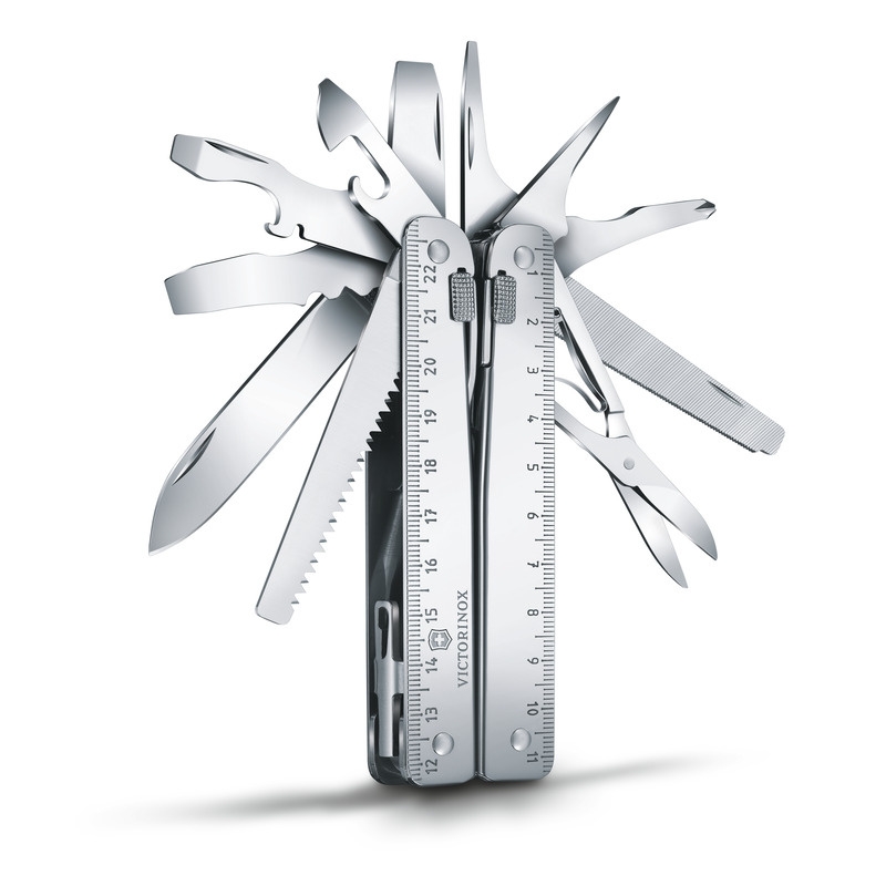 Swiss Tool X on tarjous niille, jotka etsivät jotain enemmän kuin taskuveitsi. Se on koko joukko työkaluja yhteen tyylikkääseen koteloon, jossa on hyvin harkittu muotoilu. Työkalun mukana tulee nahkakotelo. Tekniset tiedot: 1. varras 2. pihdit 3. 2 mm ruuvimeisseli 4. 3 mm ruuvimeisseli 5. langanleikkuri 6. 5 mm ruuvimeisseli 7. pullonavaaja 8. 7,5 mm ruuvimeisseli 9. terä 10. sakset 11. metalliviila 12. rautasaha 13. puusaha 14. 1-2 tähden ruuvimeisseli 15. taltta 16. laatikon avaaja 17. langan taivutuslaite 18. eristeenpoistaja 19. lankaleikkuri 20. tölkinavaaja 21. mittakuppi (23 cm) 22. mittanauha (9 tuumaa) 23. sähkökaapelin puristin 24. nahkakotelo vyölenkeillä 25. karkaistu lankaleikkuri 26. kiinnityssilmukka 27. 12 erillistä jousta 28. lukon vapautus 29. hylsysäiliö 30. hylsyavain - hylsyt mukana: 31. pieni hylsyavain - hylsyt mukana: 32. - Kuusiokolo 3 33. - Kuusiokolo 4 34. - Phillips 0 35. - Phillips 3 36. - Torx 10 37. - Torx 15 38. tilaa lisähylsylle 39. tilaa lisäkanta 40. korkkiruuvi 41. miniruuvimeisseli L2 - kaiverrus terässä L3 - kaiverrus kannessa