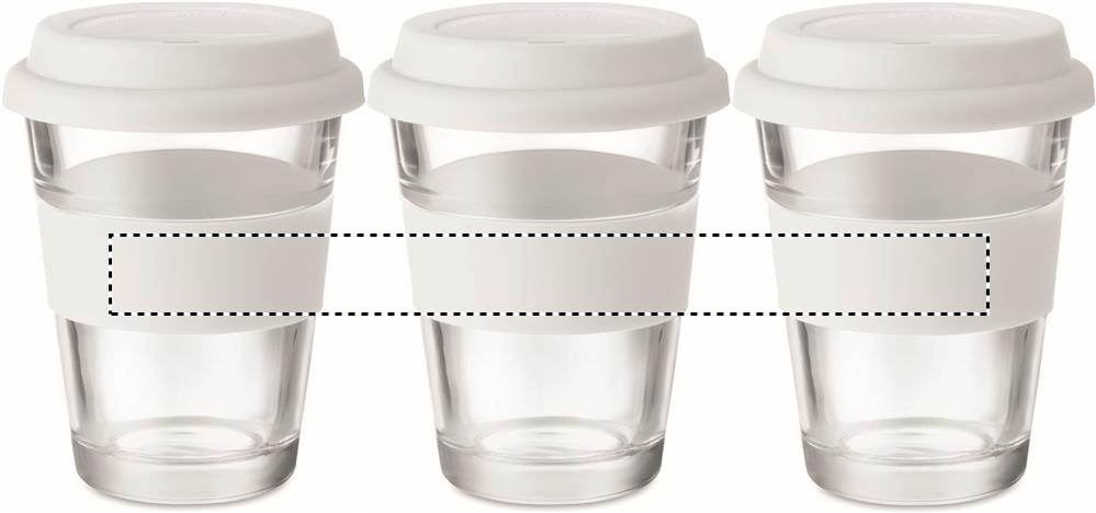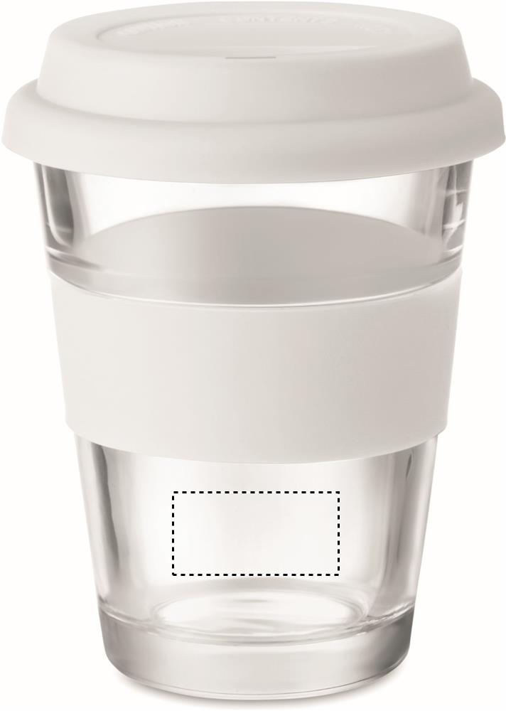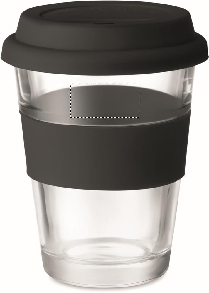 Lasinen 350 ml takeaway muki, silikonisella kannella ja gripillä. Tuote voi kuumentua ulkoisesti käytössä.
