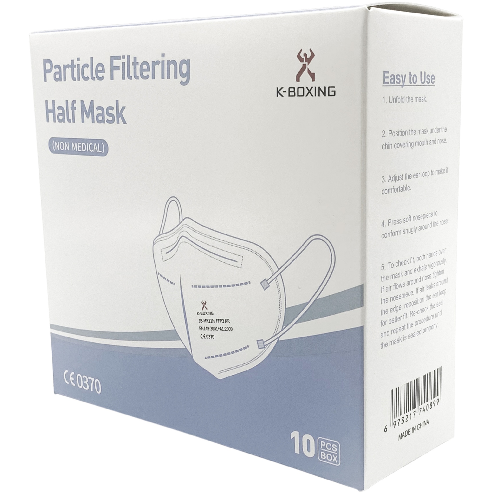 Tässä FFP2-kasvomaskissa on viisi kerrosta, pehmeät ja kestävät korvalenkit, sekä istuvuuden varmistava nenäkiinnike. Kertakäyttöisessä maskissa on korkea bakteerisuodatus ( >98%) ja sitä suositellaan väestön ja terveysalan ammattilaisten käyttöön tartuntojen ehkäisemiseksi. Suojaa ympäristöä maskin käyttäjän erittämiltä pienhiukkasilta ja käyttäjää muiden erittämiltä pienhiukkasilta. Hengittävä ja ihoa ärsyttämätön materiaali takaa käyttömukavuuden. Jokainen maski on pakattu yksittäin muovipussiin: 11,8 x 15,7 cm, toimitetaan 10 kpl:n täysiväripainetussa pakkauksessa. Pakkauksen koko 14 x 13 x 5 cm. Hyväksyntä standardin EN 149 + A1: 2009 (EUR) mukaisesti. Ce sertifikaatti: issued by LGAI – notified body 0370. Module B Certification nr: 0370-4620-PPE/B. Module C2 Certification nr: 0370-4620-PPE/C2.