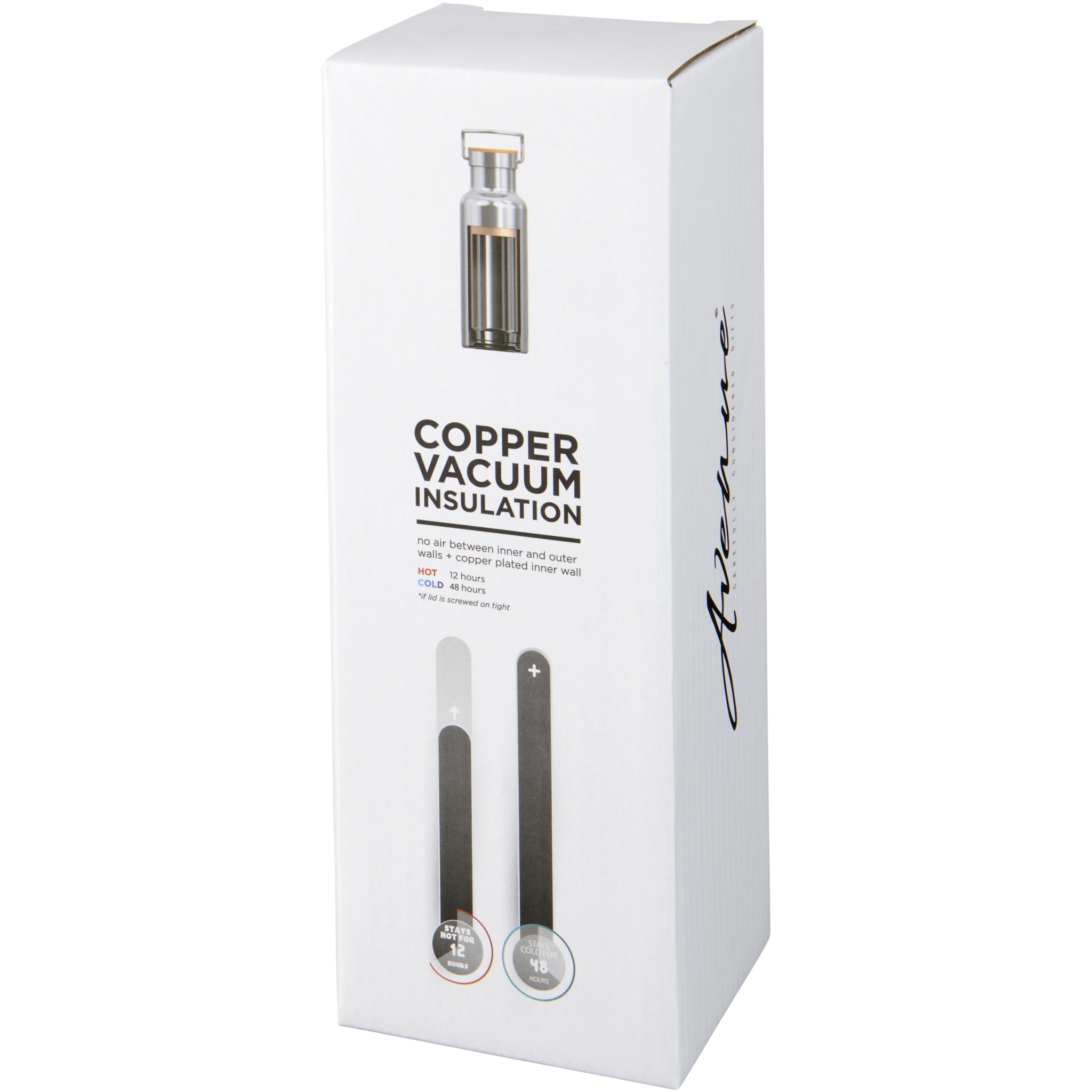 Kahdesta ruostumattomasta terässeinämästä koostuva kuparieristetty tyhjiörakenne pitää juomat kylmänä 48 tuntia tai kuumana vähintään 12 tuntia. Rakenne estää myös kondensoitumisen pullon sisällä. Kierrekorkki puuyksityiskohdalla. Trendikäs, kestävä jauhepinnoite. Pullon tilavuus on 480ml. Toimitetaan Avenue-lahjapakkauksessa.
