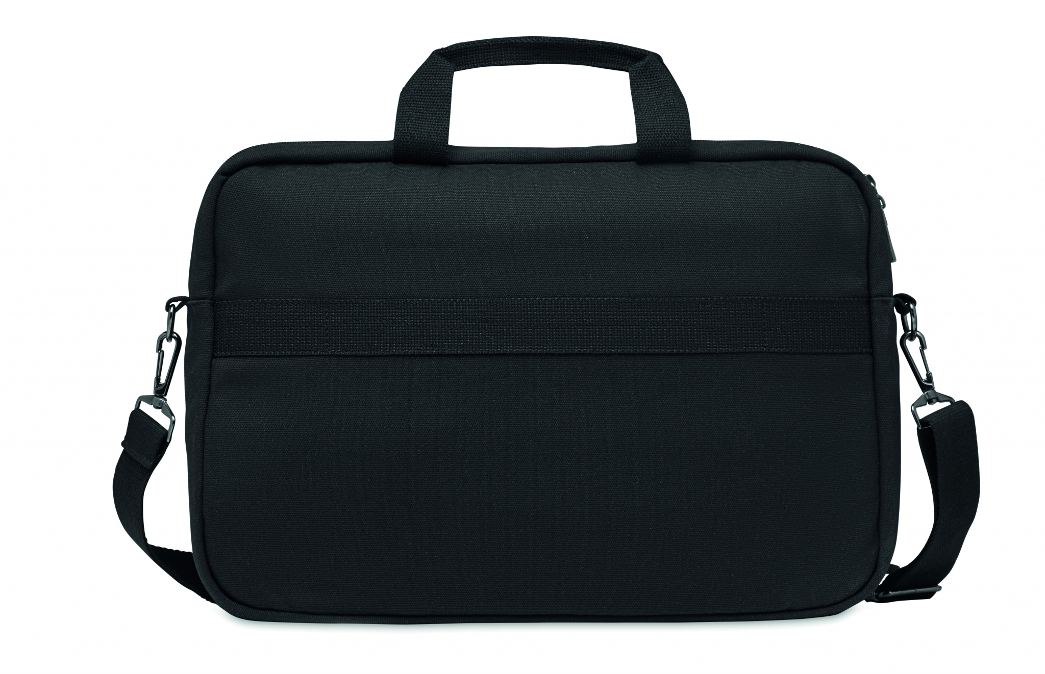 Tietokonelaukku 340 gr/m² pestyä canvaskangasta . Pehmustettu irrotettava ja säädettävä olkahihna. Selkäpuolella hihna, josta laukun saa kätevästi vetolaukun kahvaan kiinni.