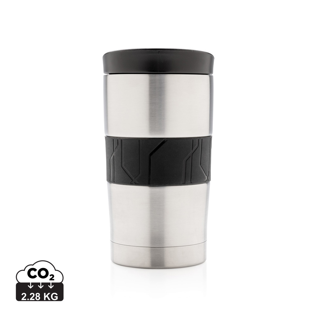 Tiivis, tyhjiöeristetty muki on valmistettu kaksiseinäisestä, ruostumattomasta teräksestä, ja siinä on silikonikahva ja liukukansi. Voidaan pestä astianpesukoneessa ja sopii useimpiin kahviautomaatteihin. Sisältö: 300 ml.