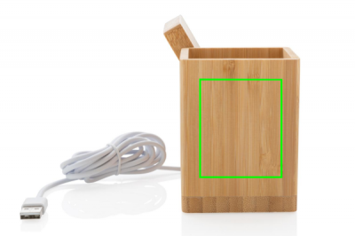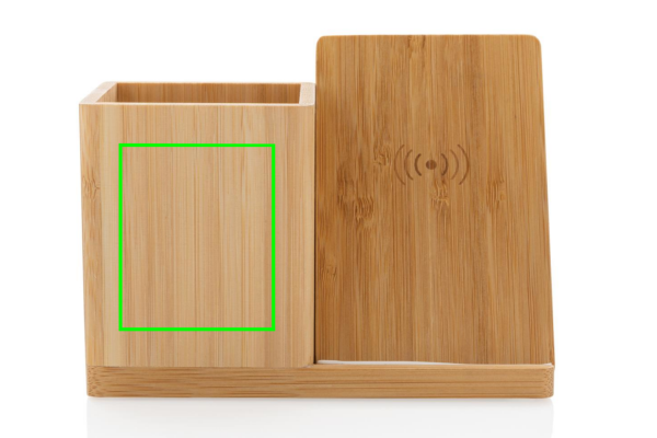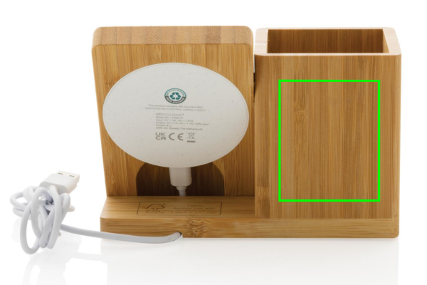 10 W belaidis greitas įkroviklis su rašiklio laikikliu, pagamintas iš RCS (Recycled Claim Standard) sertifikuoto perdirbto ABS. Bendras perdirbtas kiekis: 6% nuo bendro prekės svorio (įskaitant bambuko pagrindą) Organizatoriaus bambuko išorė yra visiškai pagaminta iš FSC 100 bambuko. Įskaitant 120 cm C tipo įkrovimo laidą, pagamintą iš RCS sertifikuoto perdirbto TPE. Supakuota į FSC mix kraft dėžutę. C tipo įvestis 5V/2A; 9V/1,67A. Belaidis išėjimas 5V/1A;9V/1.1A (10W) Registruotas dizainas®