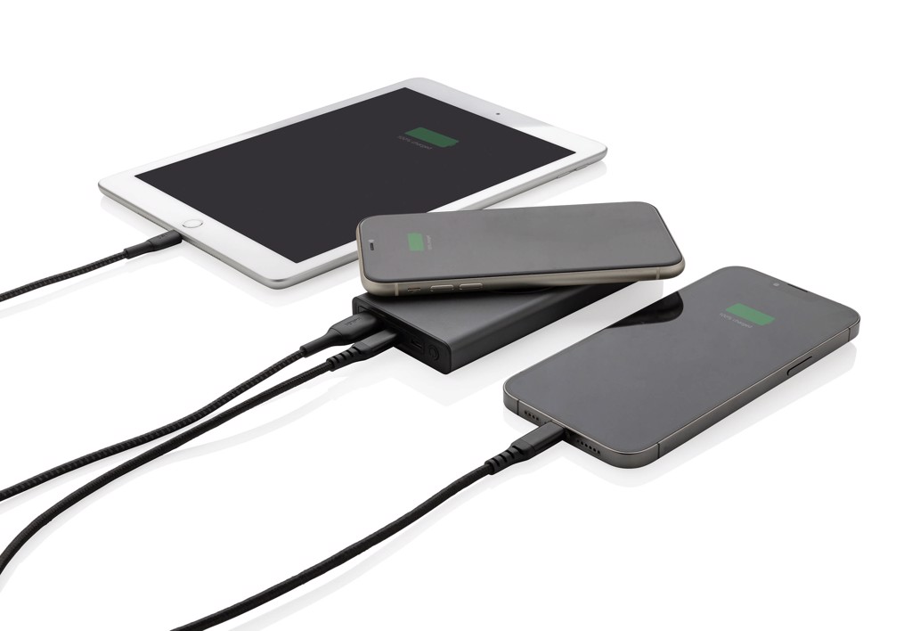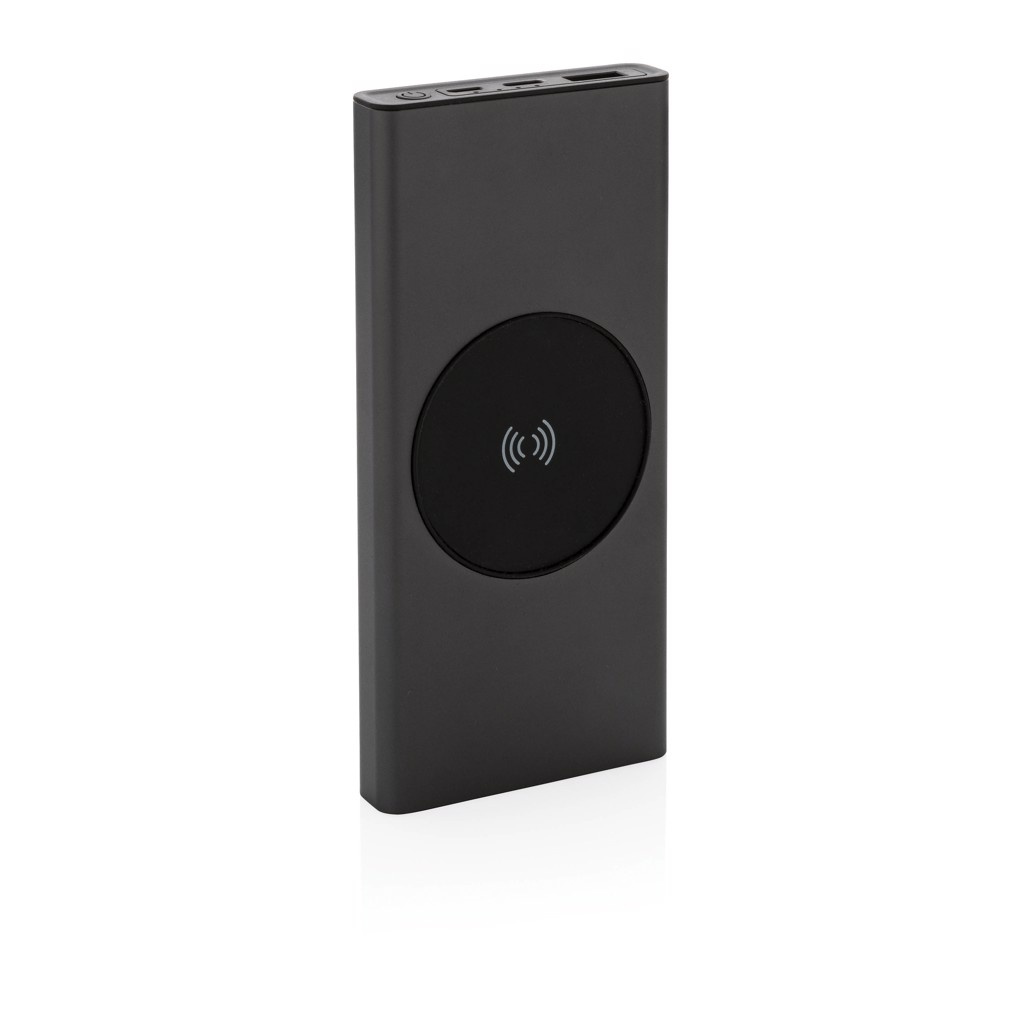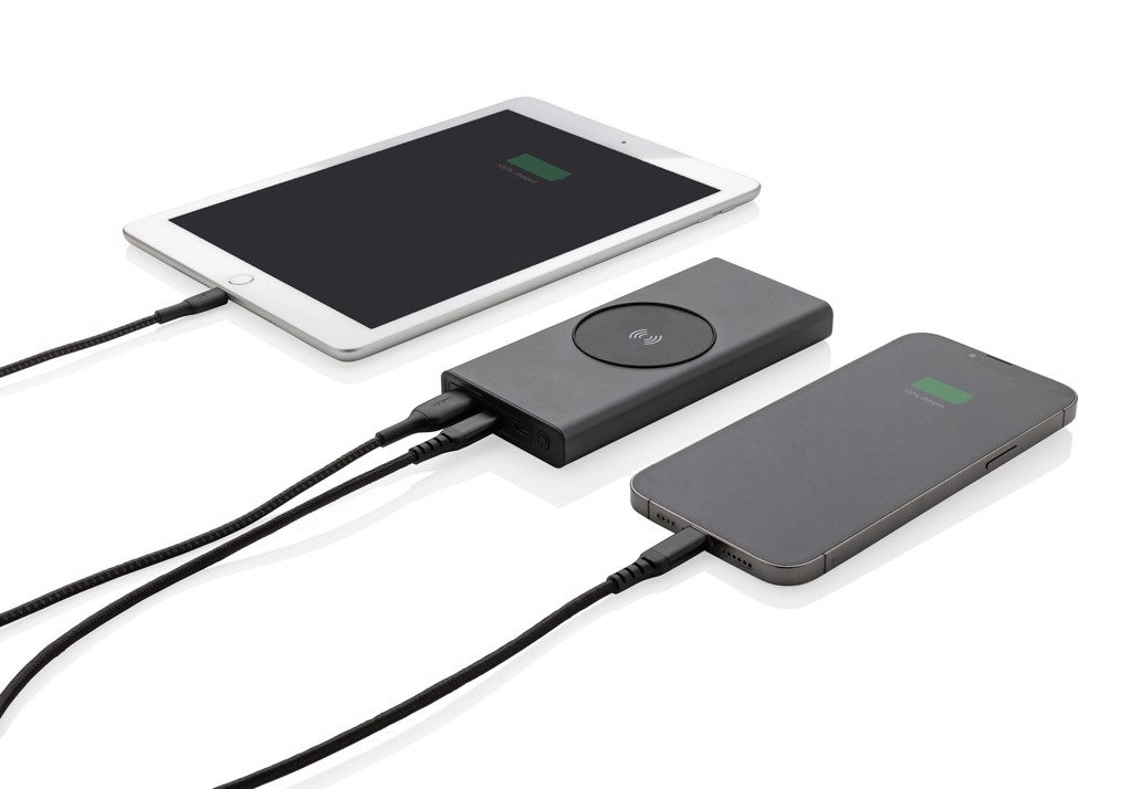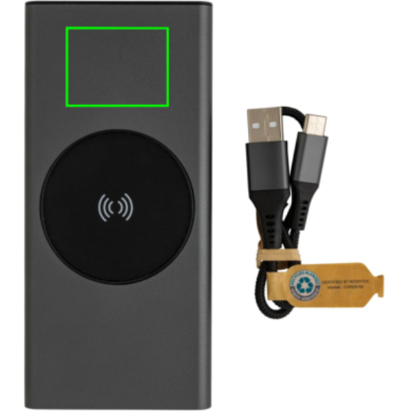 Īpaši ātras uzlādes barošanas bloks, kas izgatavots no RCS (Recycled Claim Standard) sertificēta pārstrādāta alumīnija un ABS. Kopējais pārstrādātais saturs: 28% no kopējā preces svara. RCS sertifikācija nodrošina pilnībā sertificētu pārstrādāto materiālu piegādes ķēdi. Alumīnijs nezaudē savas īpašības otrreizējās pārstrādes procesā un to var pārstrādāt bezgalīgi. Strāvas banka satur ilgstošu A klases 10 000 mAh litija polimēru akumulatoru. C izejas ports atbalsta ātru uzlādi līdz 18 W, kā arī ātru atkārtotu uzlādi 3 stundu laikā. Bezvadu lādētājs atbalsta bezvadu uzlādi līdz 10 W. Strāvas indikatori rādīs atlikušo enerģijas līmeni, lai jūs vienmēr zinātu, kad jāveic atkārtota uzlāde. Prece un aksesuāri 100% bez PVC. Ietver C tipa uzlādes kabeli, kas izgatavots no RCS sertificēta pārstrādāta alumīnija, TPE un PET. Iepakots FSC® maisījuma iepakojumā. USB izeja 5/3A, 9V/2A. 12V/1,5A. C tipa izeja: 5V/3A, 9V/2A, 12V/1,5A. C tipa ieeja: 5V/3A, 9V/2A, 12V/1,5A. Mikro USB ieeja: 5V/2A, 9V/2A, 12V/1,5A.