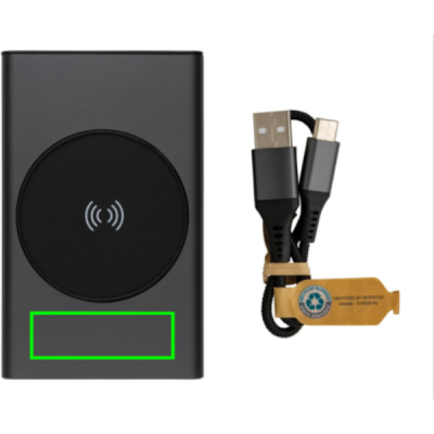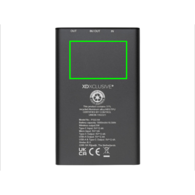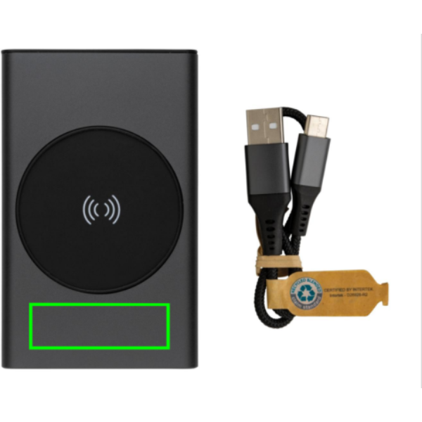 Powerbank izgatavots no RCS (Recycled Claim Standard) sertificēta pārstrādāta alumīnija un ABS. Kopējais pārstrādātais saturs: 31 %, pamatojoties uz izstrādājuma kopējo svaru. RCS sertifikācija nodrošina pilnībā sertificētu pārstrādāto materiālu piegādes ķēdi. Alumīnijs nezaudē savas īpašības pārstrādes procesā un to var pārstrādāt bezgalīgi. Strāvas banka satur ilgstošu A klases 5000 mAh litija polimēru akumulatoru. Bezvadu lādētājs atbalsta bezvadu uzlādi līdz 5W. Strāvas indikatori parādīs atlikušo enerģijas līmeni, lai jūs vienmēr zinātu, kad uzlādēt. Prece un aksesuāri 100% bez PVC. Ietver C tipa uzlādes kabeli, kas izgatavots no RCS sertificēta pārstrādāta alumīnija, TPE un PET. Iepakots FSC® maisījuma iepakojumā. USB izeja 5/2.4A, C tipa izeja: 5V/2.4A. C tipa ieeja: 2,4A. Mikro USB ieeja: 5V/2A.