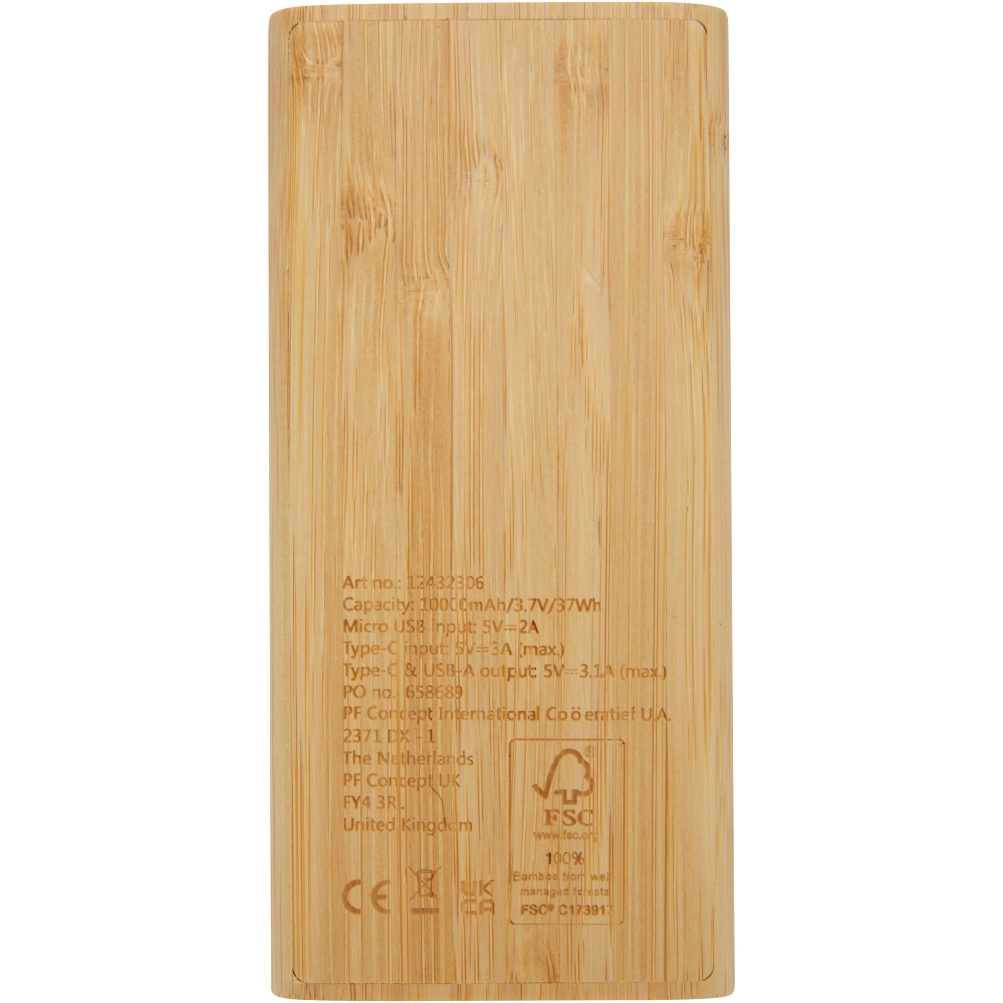 10 000 mAh barošanas bloks, kas izgatavots no bambusa, ar ON/OFF skārienpogu un 4 LED indikatoriem, kas parāda atlikušo akumulatora jaudu. Micro USB ieeja 5V/2A, C tipa ieeja 5V/3A, C tipa izeja 5V/3.1A max, dubultā USB-A izeja 5V/3.1A max, kopējā jauda 15.5W. Tiek piegādāts ar 30 cm TPE 3A Type-C uz Type-C uzlādes kabeli, lietošanas instrukciju un kraftpapīra dāvanu kastīti. Tā kā bambuss ir dabisks izstrādājums, katrai vienībai var būt nelielas krāsas un izmēra atšķirības, kas var ietekmēt galīgo drukas rezultātu.
