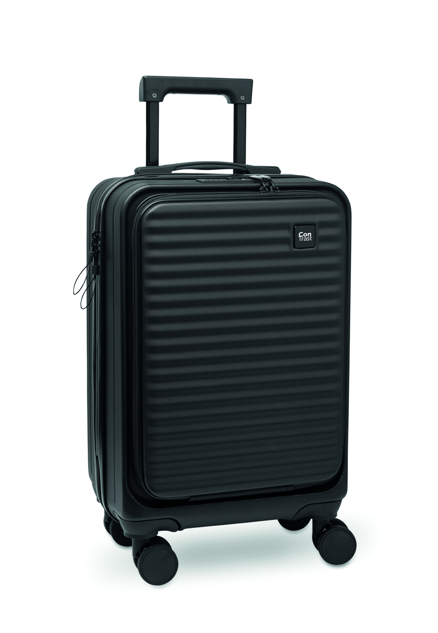 20 inch hard-shell trolley in ABS. 1 main compartment with inner compartment. Additional front zippered compartment for documents and padded 15'' laptop compartment. Includes a security lock (TSA). Rides on 4 wheels.