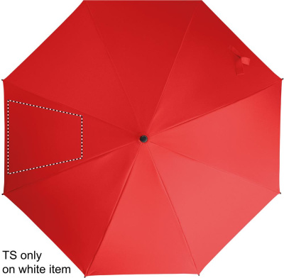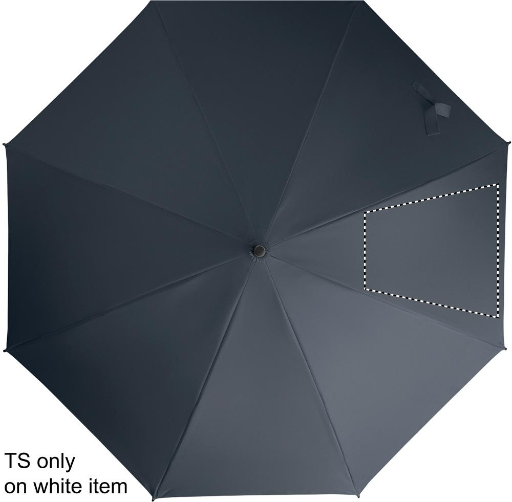 23 inch straight auto open windproof umbrella with full fibreglass frame and panels in 190T pongee fabric. Plastic tips and top. Rubberized PP plastic curved handle. Manual closure.