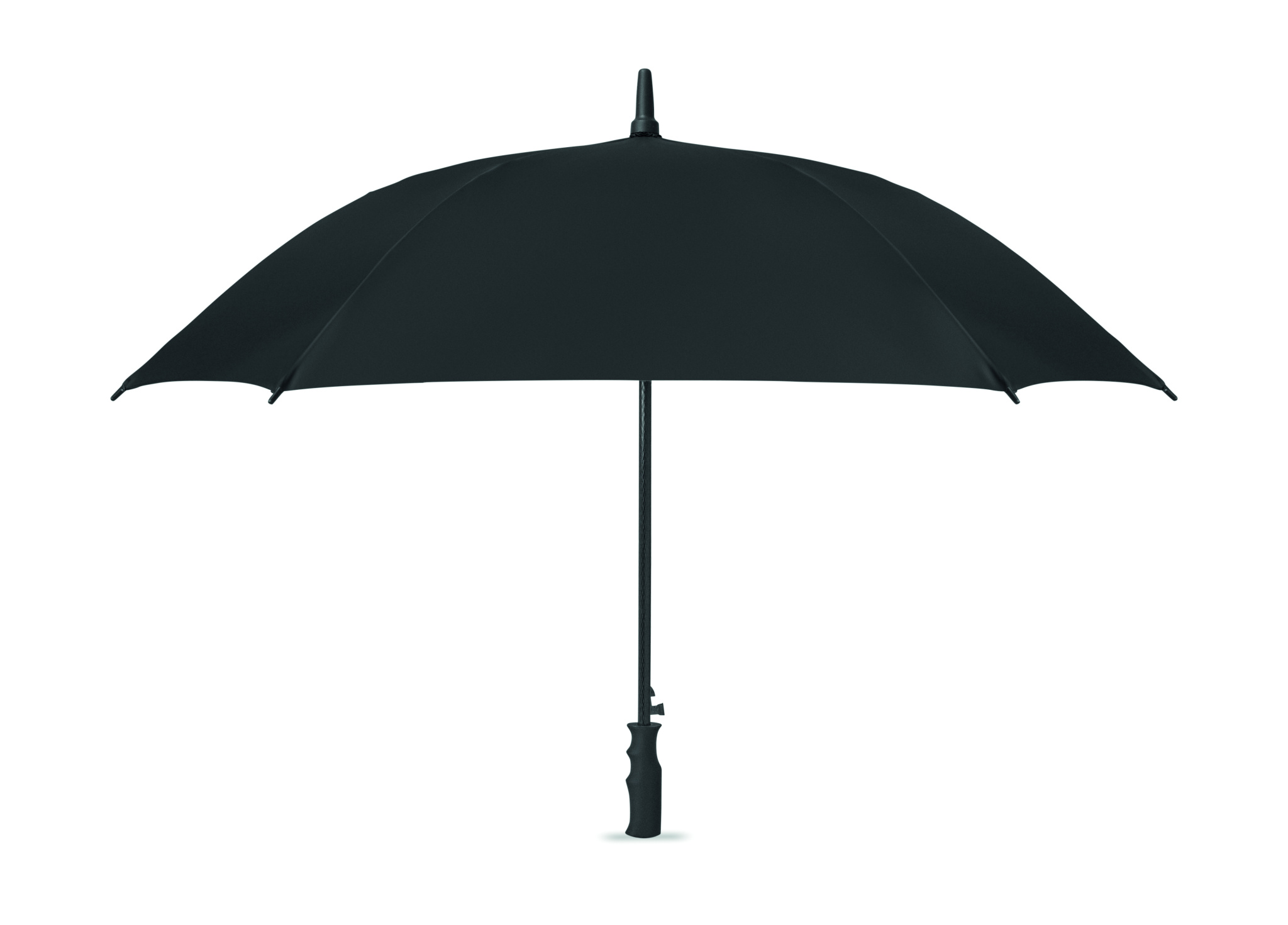 23-inch windproof auto-open square umbrella in 190T pongee polyester. Features full fibreglass frame and ribs, rubber-finished ABS handle.