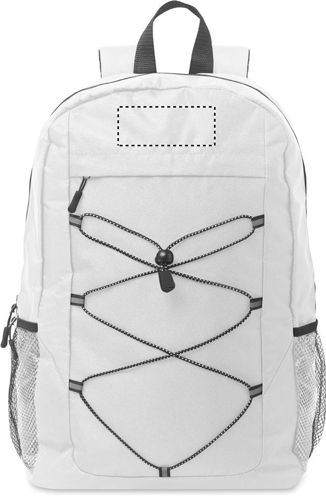 Backpack in 600D RPET polyester with decorating cord and front zippered pocket panel. Mesh pockets on both sides.