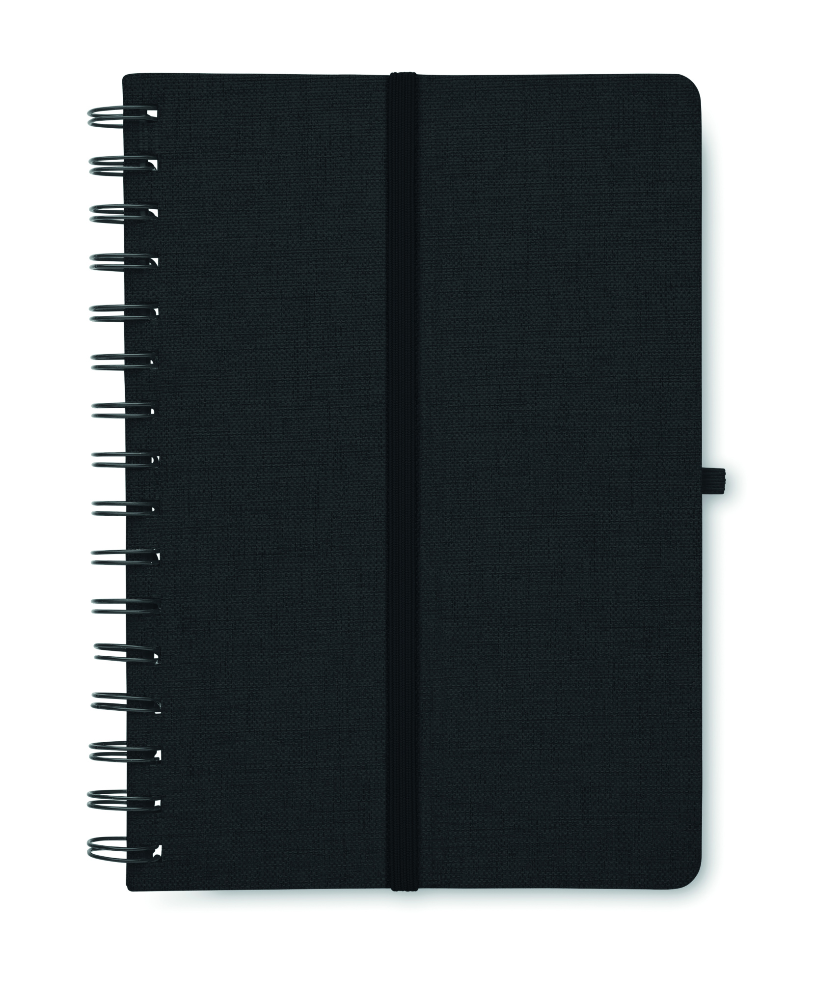 A5 notebook with 600D RPET hard cover with smartphone stand function. Twin-wire. 160 lined pages (80 sheets). 70 gsm recycled paper. Elastic closure strap.