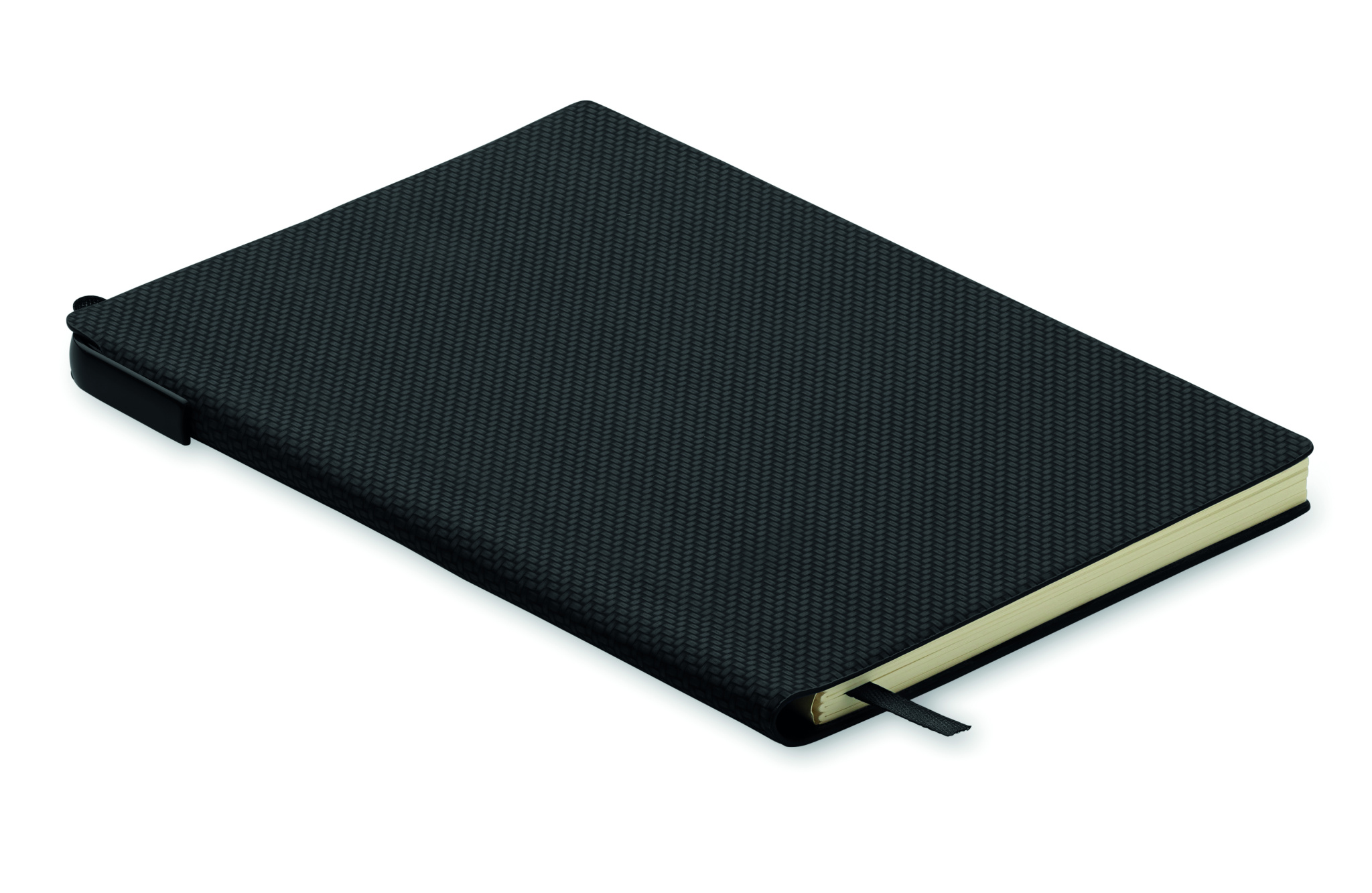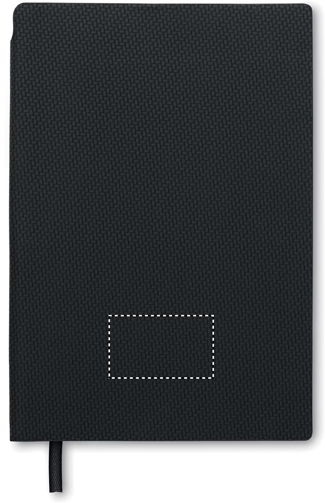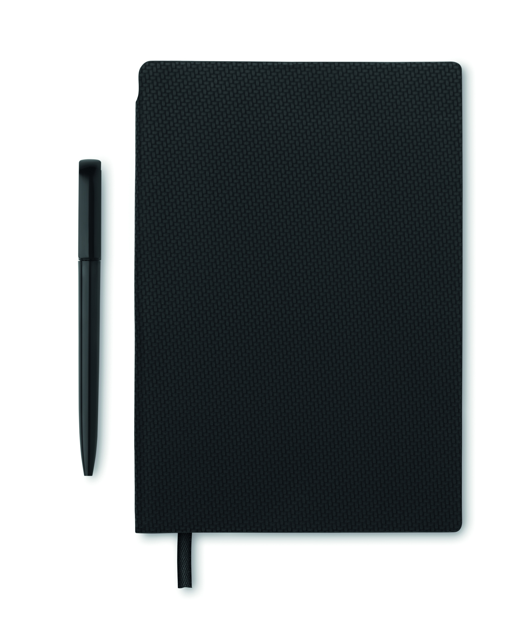 A5 notebook with structured PU cover with ABS twist ball pen inside spine pen holder. Case bound. 160 lined pages recycled paper (80 sheets).