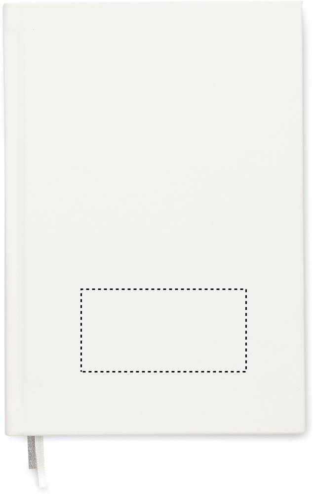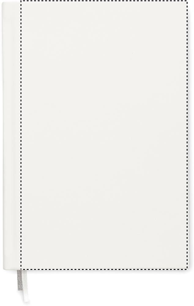 A5 journal notebook in 60% recycled post consumer polyester and 40% PU cover. Casebound. 256 lined pages in 70gsm recycled paper (128 sheets). With 2 polyester ribbon page markers.