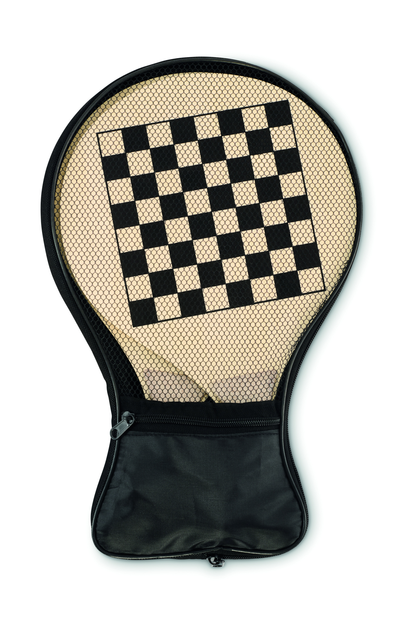 Beach set with 2 plywood rackets featuring a chess and ludo game boards. Includes 1 TPR ball, dice and checkers. Packed in RPET mesh zippered carrier bag.