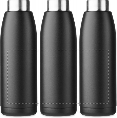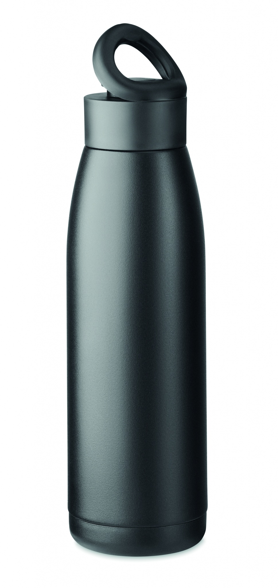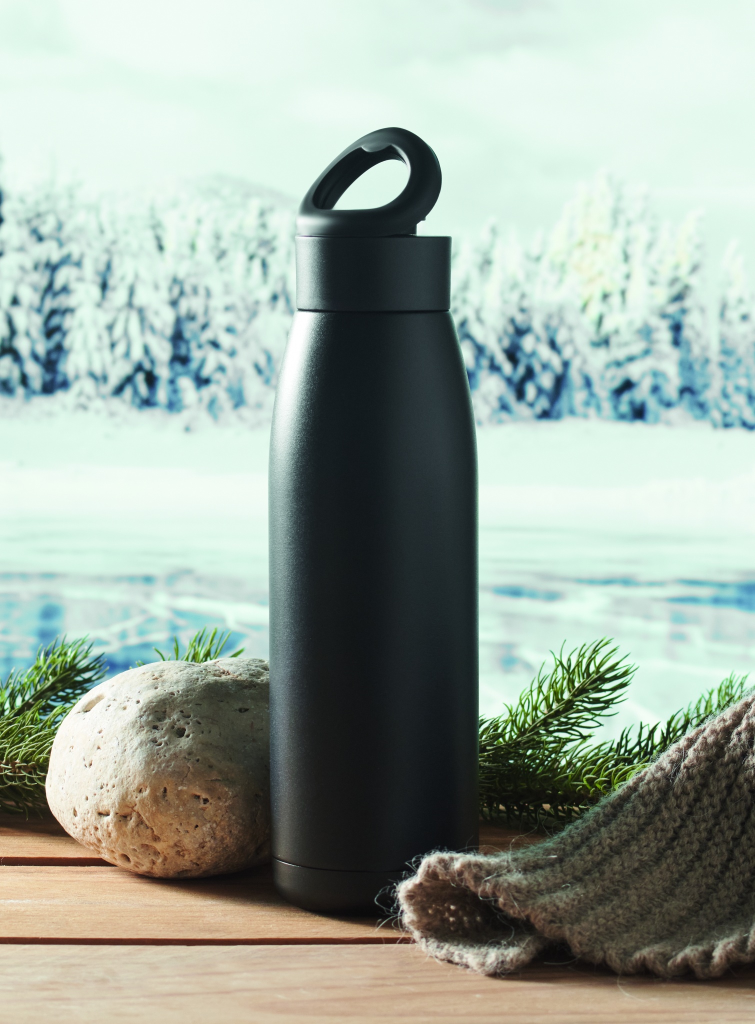 Бутылка с двойными стенками из переработанной нержавеющей стали (90%) и обычной нержавеющей стали (10%) и мягкой силиконовой крышкой с кольцом для переноски. При простом встряхивании бутылки температура меняется на нагрев или охлаждение, в зависимости от жидкости внутри. Герметична. Объем: 400 мл.