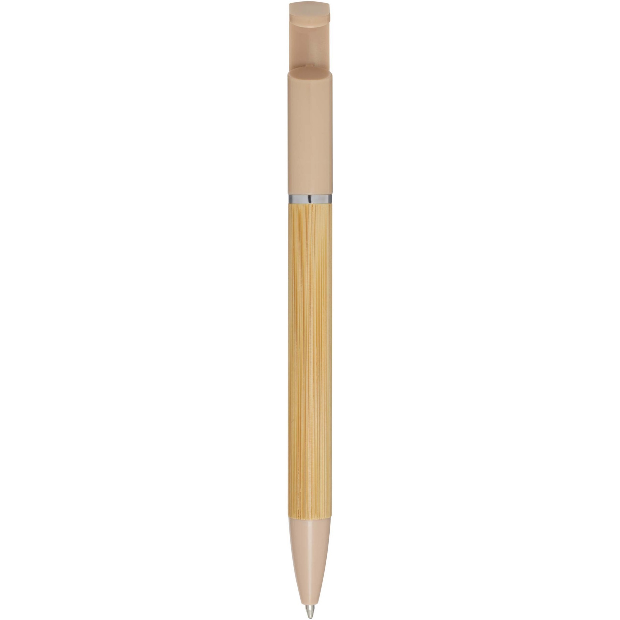 Бамбуковая шариковая ручка, которая также может служить подставкой для телефона. Кнопка и среднее кольцо изготовлены из переработанного пластика, наконечник — из латуни, а корпус — из бамбука, полученного из ответственных источников. Цвет чернил: синий. Длина непрерывной линии: 1000 метров. Размер пера: 1,0 мм.