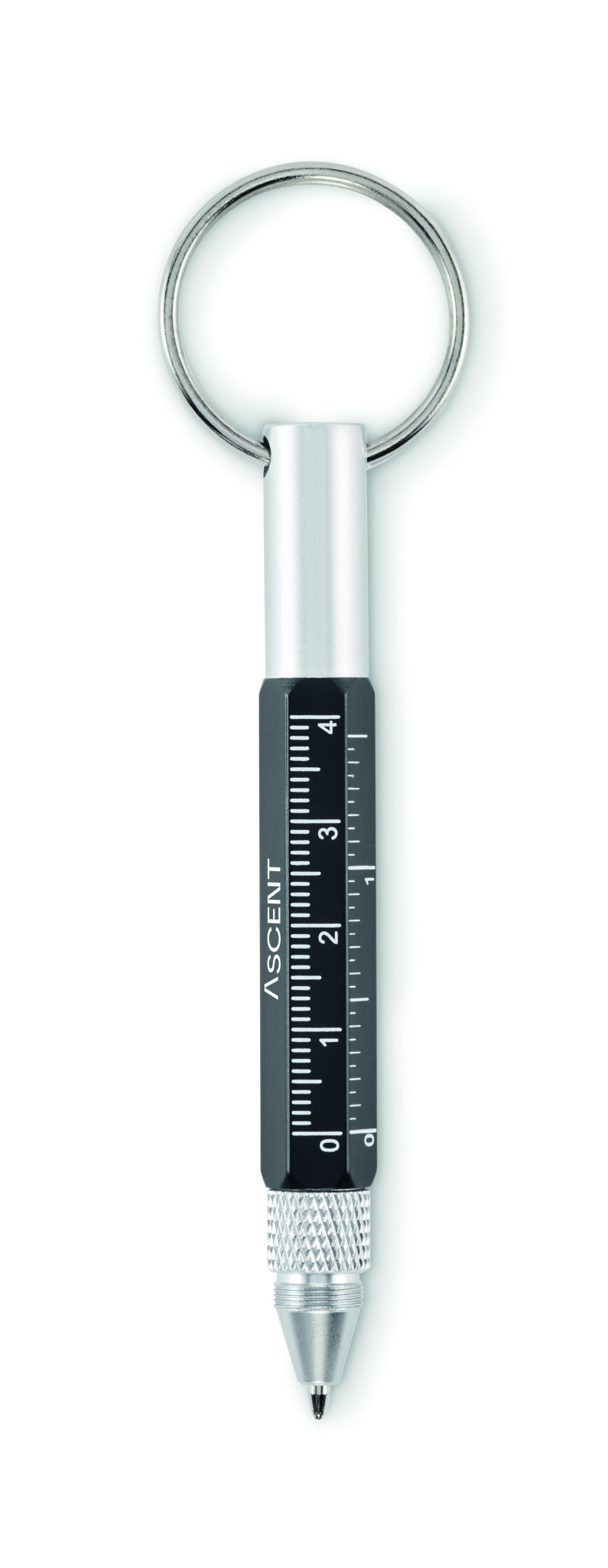 Key ring with twist action pen in recycled aluminium with 4cm/ 1,5 inch ruler, stylus and 2 in 1 phillips and flat head screw driver. Black ink.