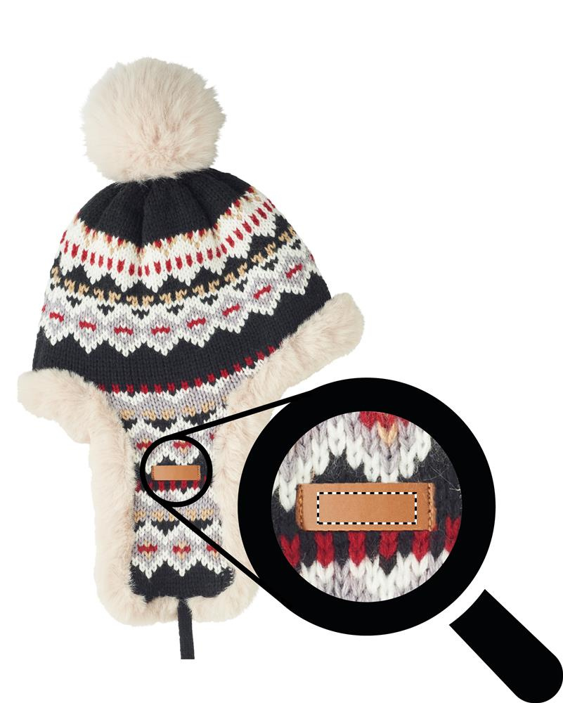 Knitted beanie with ear flaps and pompom in acrylic fibre with polyester and fleece lined. Includes label for printing area on one side. Adult size.