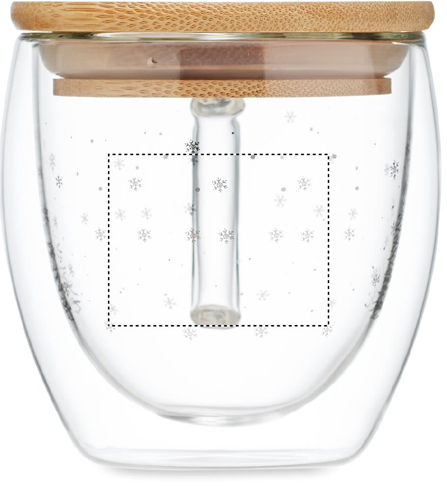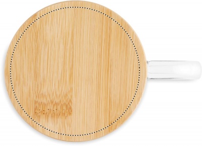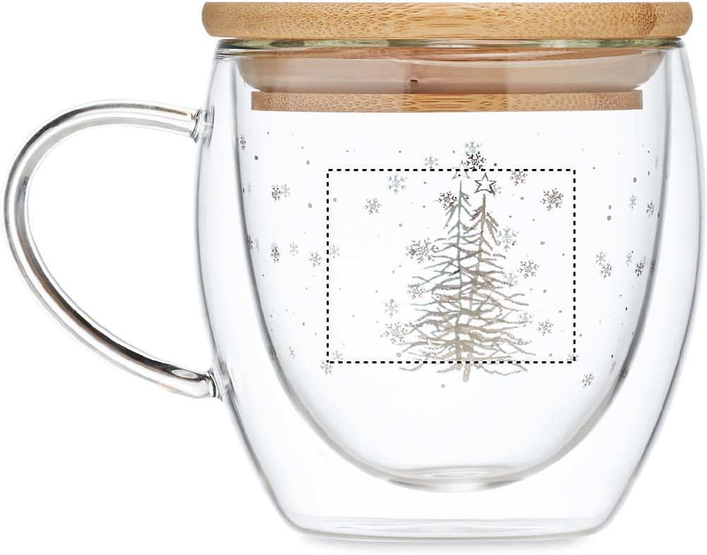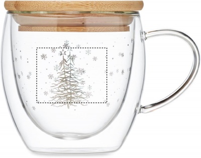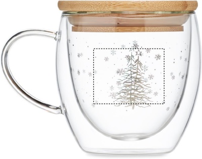 Кружка с двойными стенками из боросиликатного стекла с бамбуковой крышкой (рисунок дерево). Объем: 220 мл.