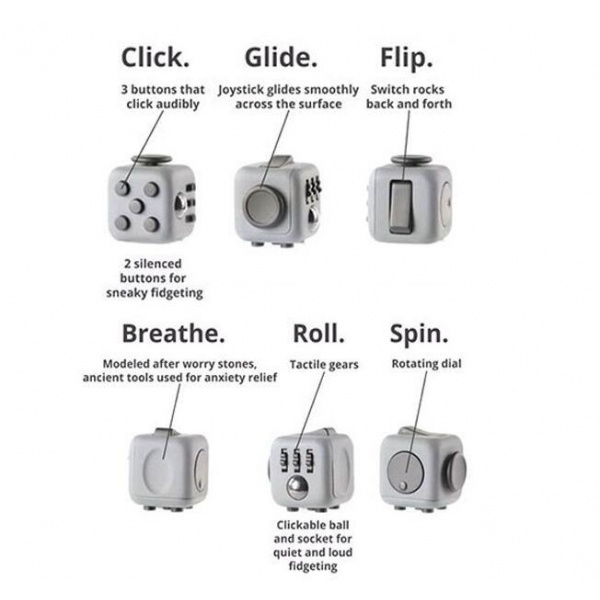Fidget Cube — это настольная игрушка для тех, кто любит понервничать. У него шесть сторон. На каждой стороне есть что-то, с чем можно понервничать: щелкнуть, поскользнуть, перевернуть, вдохнуть, покатиться, покрутиться. Fidget Cube доступен в 10 различных цветовых схемах: черный, желтый, розовый, зеленый, синий, серый.