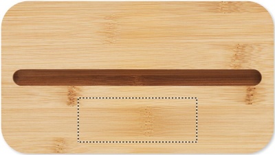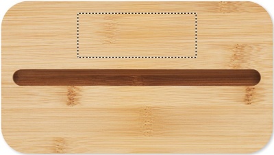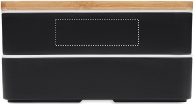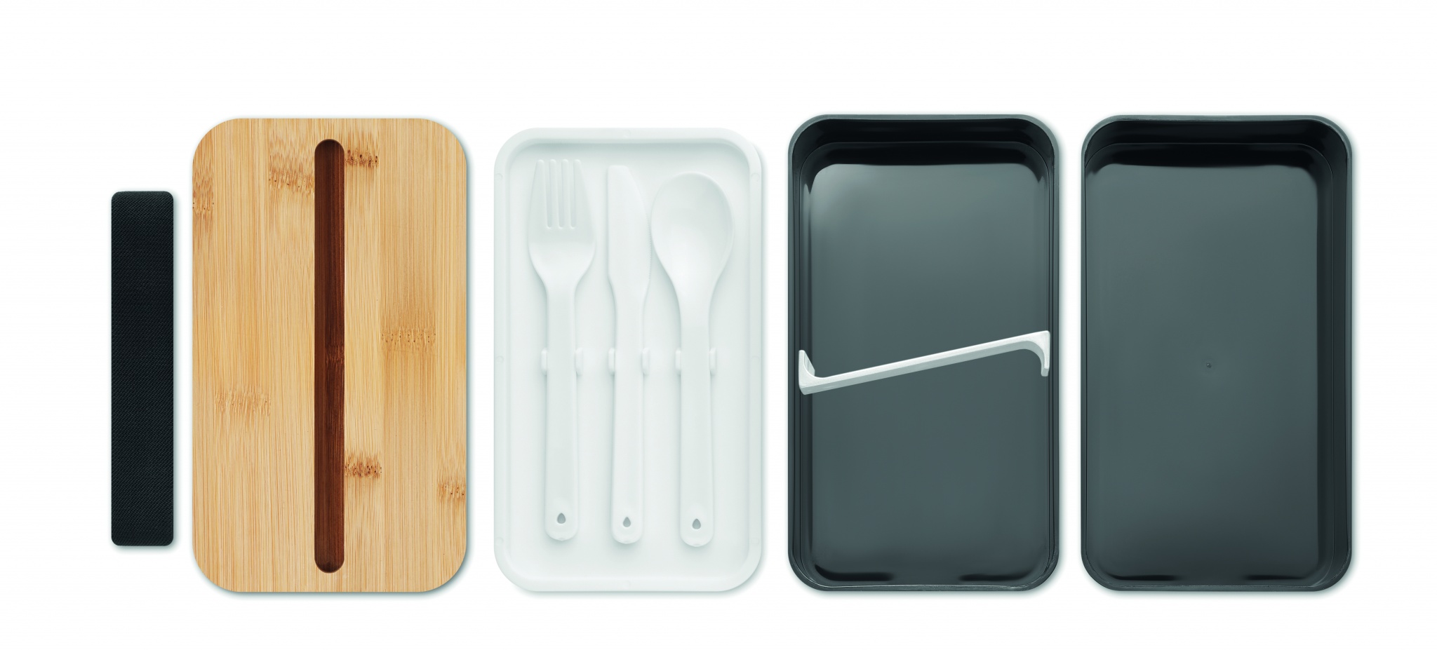 Двухуровневый ланч-бокс из переработанного полипропилена со съемным разделителем, 3 столовыми приборами и бамбуковой крышкой с прикрепляемой полиэстеровой лентой. На крышке имеется подставка для телефона. Вместимость: 400 мл (2x).