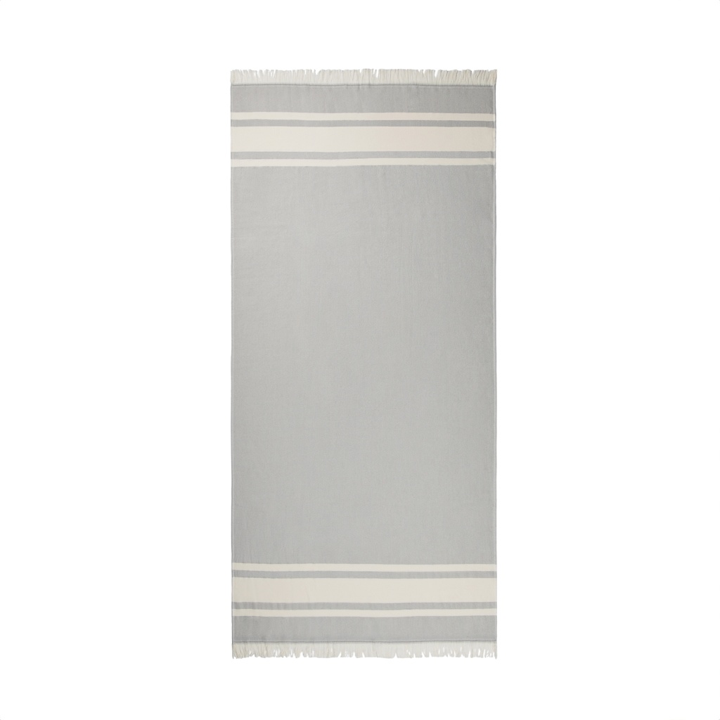 Полотенце для хаммама с двумя различными типами текстуры: одна сторона махровая, а другая — полотняного переплетения. Двусторонний дизайн делает это полотенце идеальным спутником на пляже, у бассейна или во время приключений на свежем воздухе. Оно отлично впитывает влагу и быстро высыхает. Полотенце изготовлено из 75% хлопка и 25% полиэстера и имеет толщину 360 г/м². Размеры: 180x80 см, без бахромы в 5 см. OEKO-TEX® STANDARD 100. 09.HIN.68091. Hohenstein HTTI.