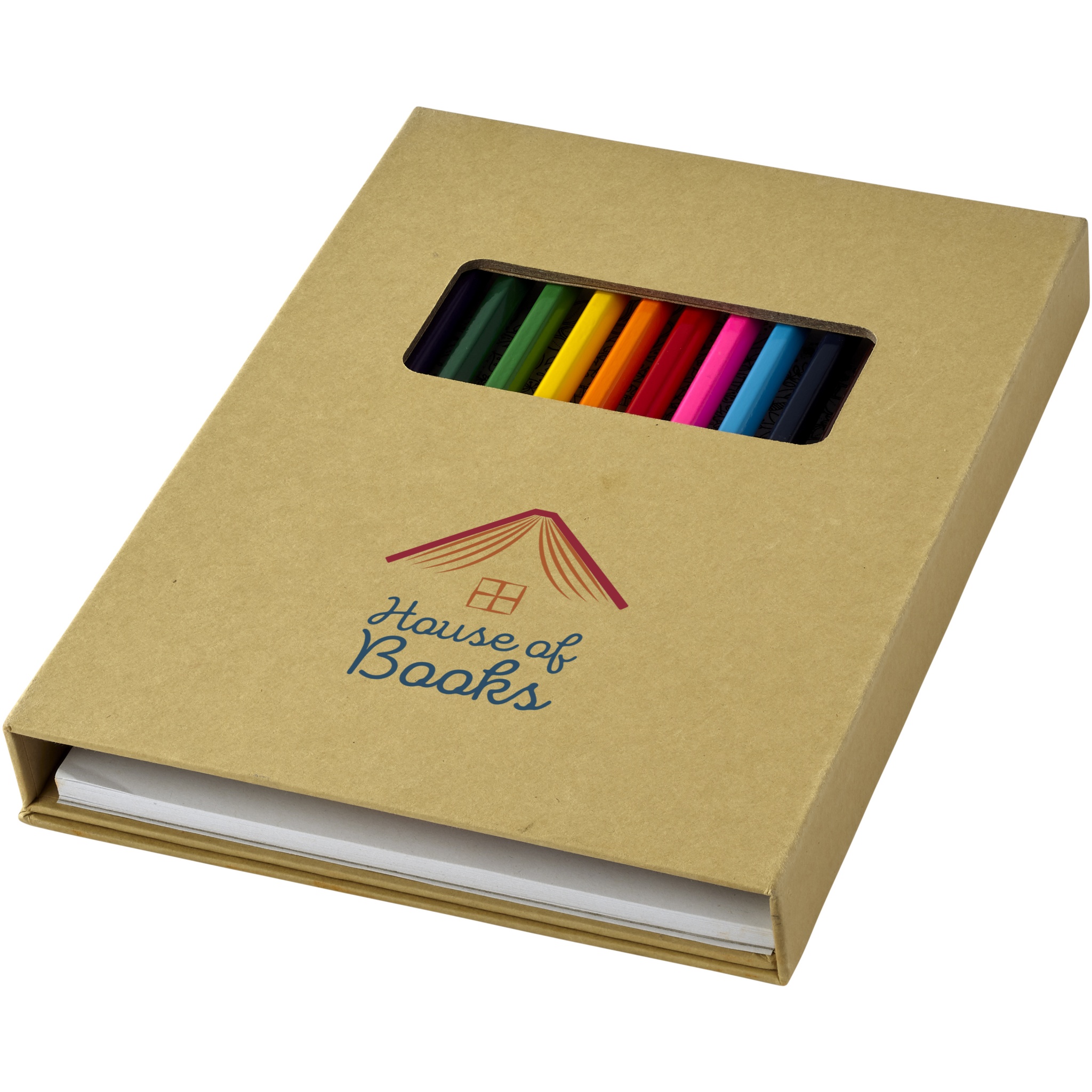 12 цветных карандашей, 10 страниц для раскрашивания и 40 белых листов для рисования. Набор упакован в бумажную коробку. Нанесение не предлагается на элементы.