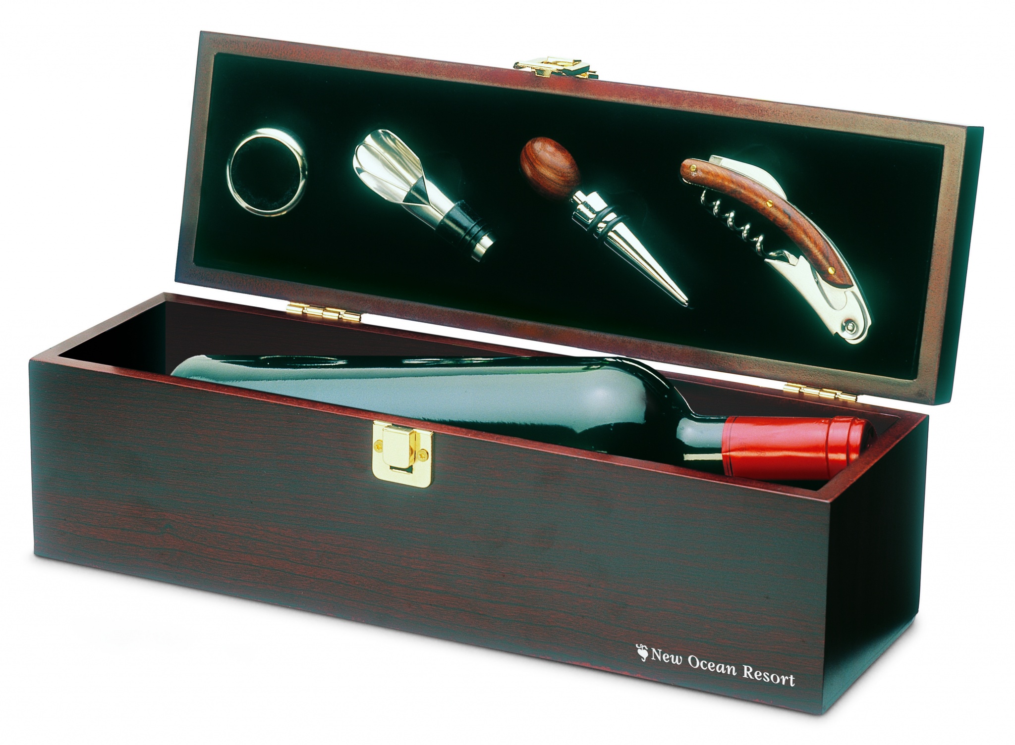 Деревянная подарочная коробка под одну бутылку вина с аксессуарами. Вино в комплект не входит.