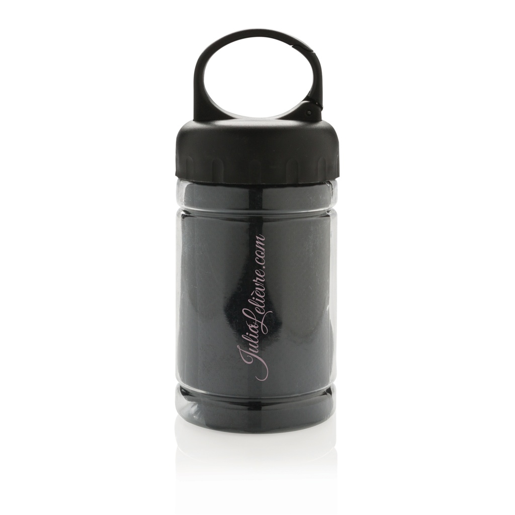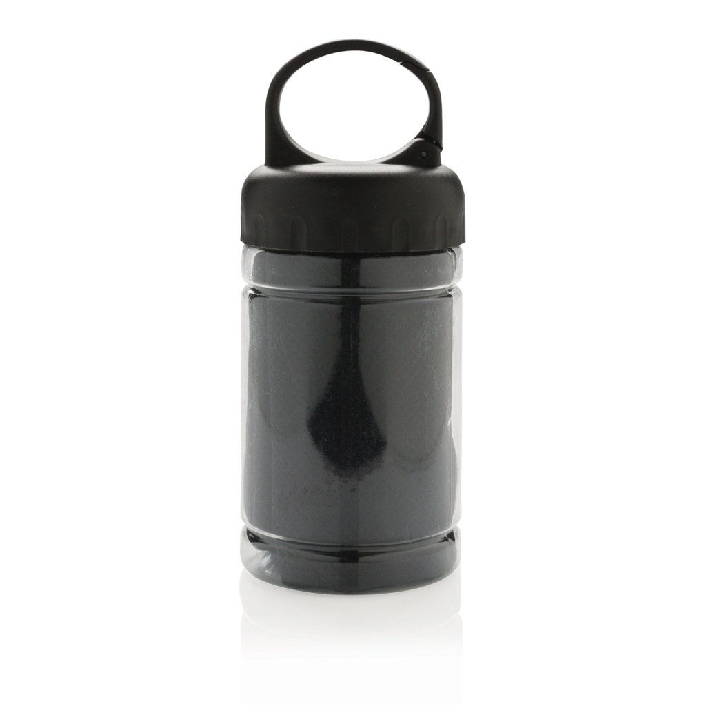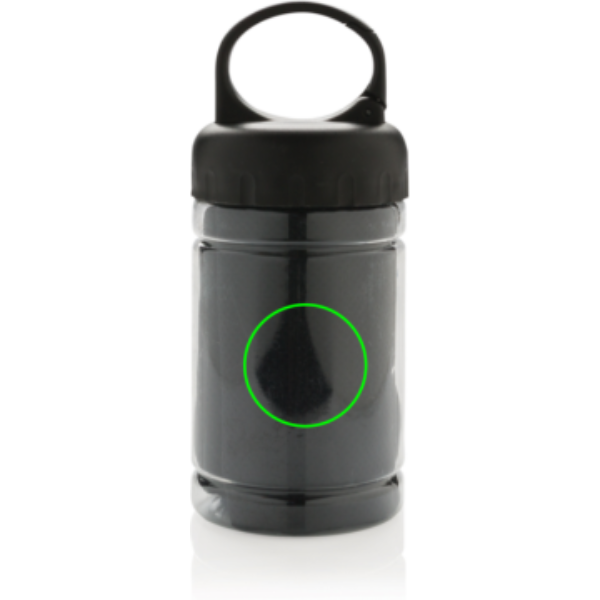 Охлаждающее полотенце из микрофибры на 100% без химикатов. 98% солнцезащитная функция до защиты от УФ-излучения 50+. Полотенце можно легко использовать, добавив немного холодной воды в бутылку, что создаст прохладное полотенце для быстрого освежения. Бутылка изготовлена из полипропилена с верхом из АБС и карабином, чтобы брать с собой на активный отдых. 77 x 30 см.