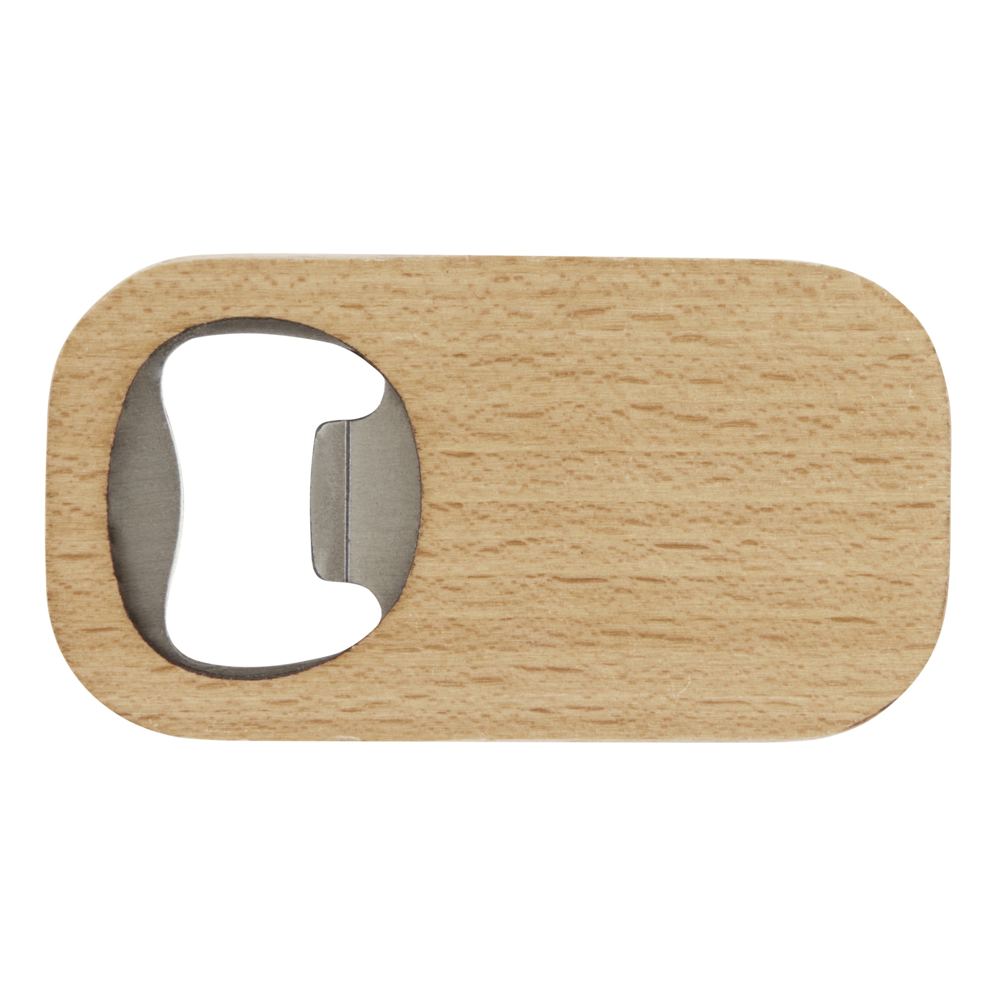 Открывалка для бутылок из нержавеющей стали с деревянной поверхностью.