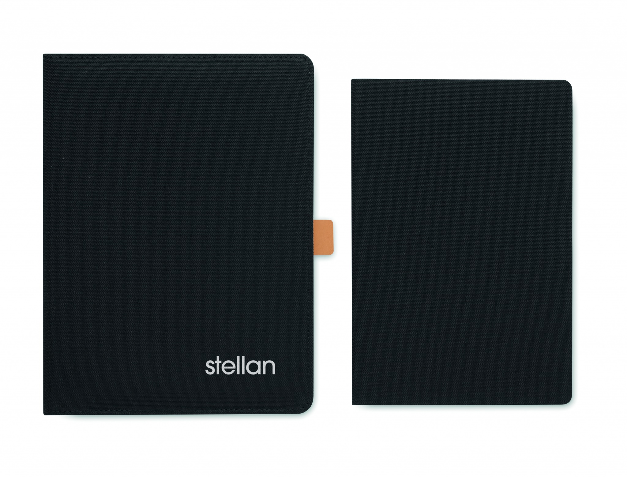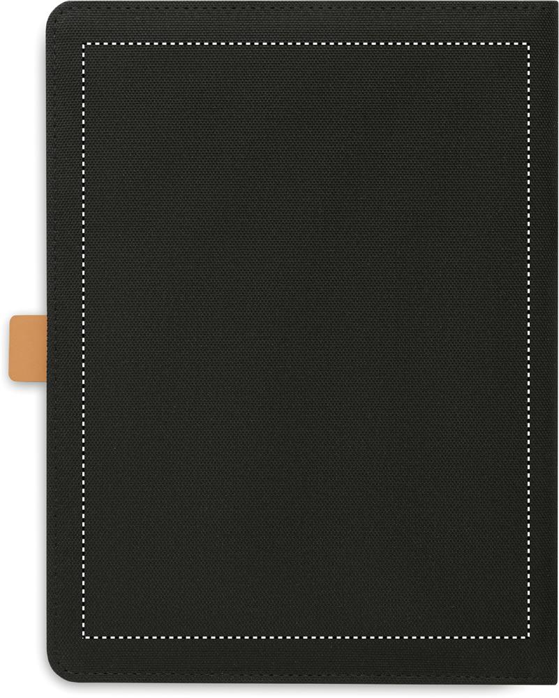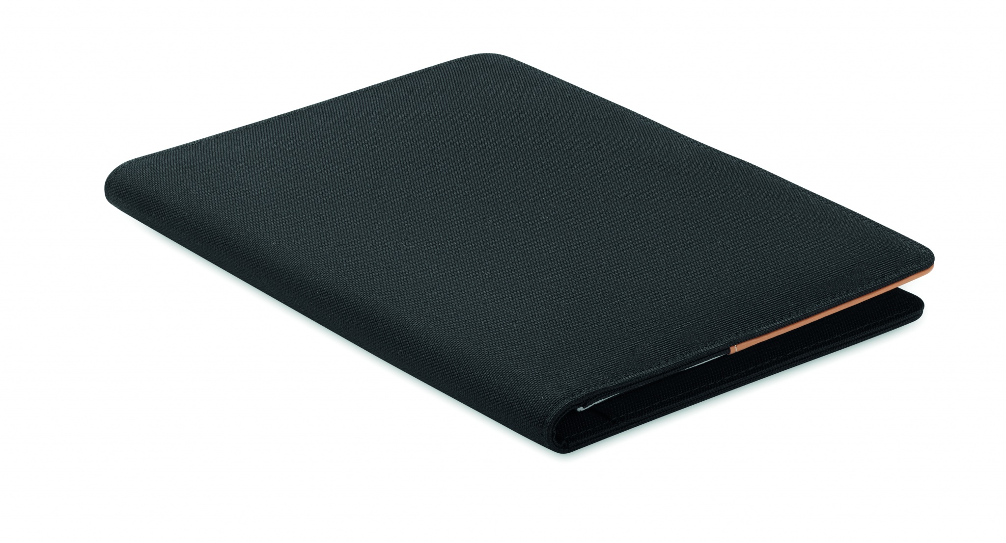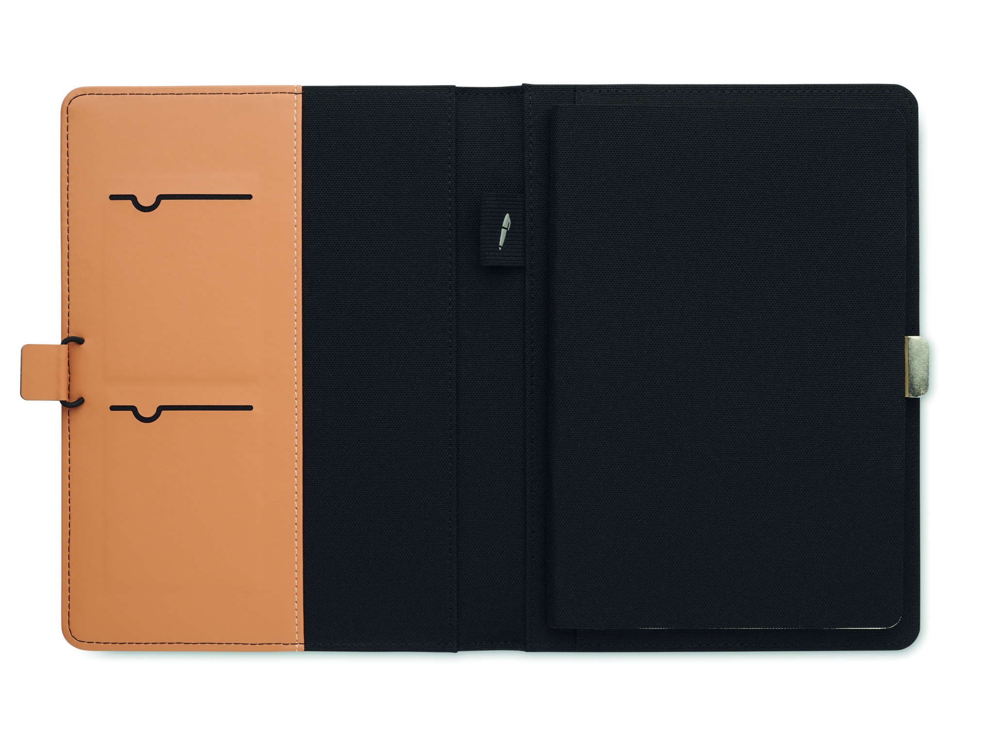 Папка формата А5 из RPET с деталями из искусственной кожи. Сменный блокнот формата А5 в твердой пробковой обложке и переплете. 128 линованных страниц из переработанной бумаги (64 листа). Держатель для ручки. 2 отделения для визиток и одно большое отделение. Эластичный ремешок с металлическими деталями.